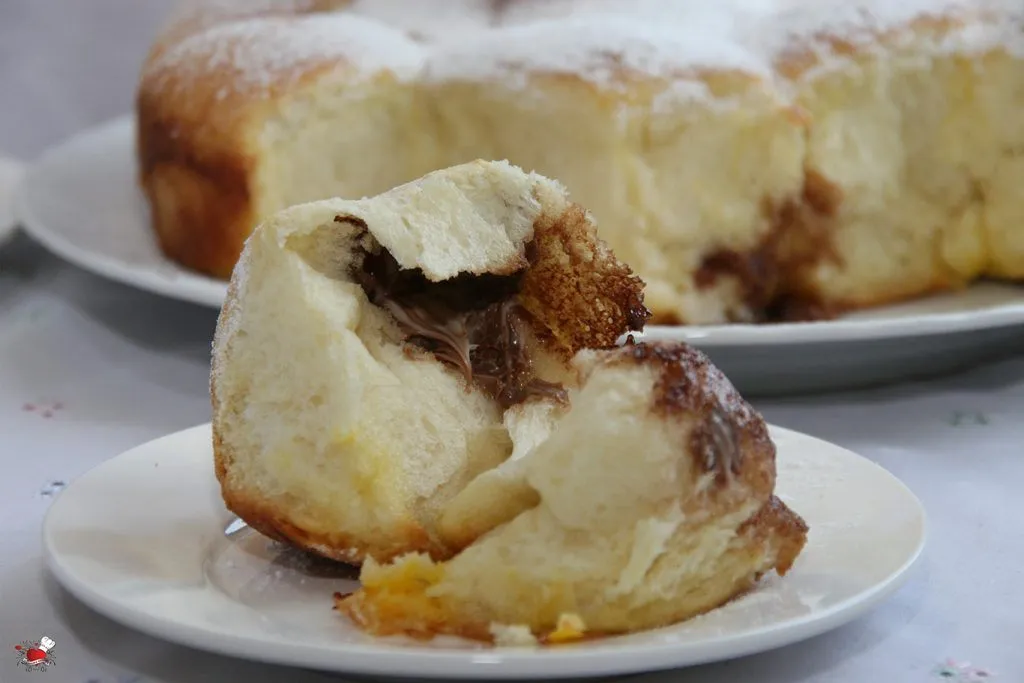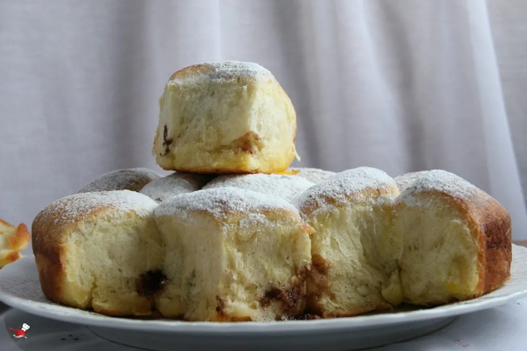 U mlako mleko dodajte 1 kašiku šećera, kesicu kvasca i jednu kašiku brašna. Ostavite kvasac desetak minuta da se aktivira. U veću posudu pomešajte veći deo brašna i ostale suve sastojke. Dodajte aktiviran kvasac, jaje i žumanca, omekšan maslac iseći na manje komade i takođe dodajte u brašno. Umesite mekše glatko testo, po potrebi dodajući brašno da se dobije fina struktura testa. Testo blago premažite maslacem, pokrite pamučnom krpom i ostavite oko 30 minuta da testo naraste. Naraslo testo izručite na dasku za mešenje, odvojite od testa 20 jednakih loptica i malo ih oblikujte. Svaku lopticu istanjite na dlan ili uz pomoć oklagije da se dobije lep krug prečnika oko 9 cm. Na svaki krug stavite kašiku nutele ili eurokrema (koja je dobro ohlađena pre toga), po želji možete koristiti i malo gušći džem (ako je suviše tečan, džem će iscureti sa strane). Svaki krug testa sa kremom na sredini savite, stisnite prstima sa svih strana da se dobije lepa kuglica. Svaku kuglicu premažite uz pomoć silikonske četkice dok je još na dlanu otopljenim maslacem i ređajte je u dublju posudu za pečenje koju ste pre toga takođe premazali maslacem. Vodite računa da između svake kugle testa ostane dovoljno mesta, testu treba prostora da lepo naraste. Deo gde se testo oko punjenja zatvara uvek okrenuti ka dnu tepsije (dubina tepsije ili pleha ne treba biti manja od 5 cm, a prečnik najmanje 28 cm ili veći). Pripremljene buhtle pokrite krpom i ostavite oko 30 minuta da još malo narastu. Buhtle pre pečenja premažite ostatkom maslaca i žumancetom u koliko to želite, nije obavezno.