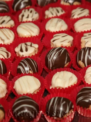 Potrebno je: 250 g buter, 250 g šećera u prahu, 250 g mlevene plazme, 250 g neslanog pečenog kikirikija, sok od narandže. Za preliv: 150 g crna čokolada, 150 g bela čokolada. 4 – 5 …