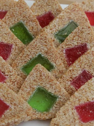 Jednostavna a vrlo ukusna poslastica, za sve ljubitelje susama Potrebno je: 300 g ratluka, 300 g susama, 150 g žele bombona. Priprema: Pripremiti trouglasti kalup, obložiti ga samolepljivom folijom i premazati je sa nekoliko kapi …