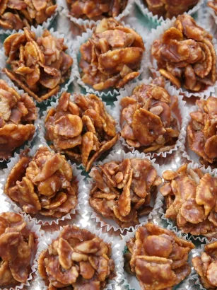 Potrebno je: 250 g pahuljica Corn fleksa, 200 g kristal šećera, 150 g čokolade, 250 g margarina, 100 g seckanih oraha, 100 g suvog grožđa, 8 supenih kašika meda, oko 40 papirnih korpica. Priprema: …
