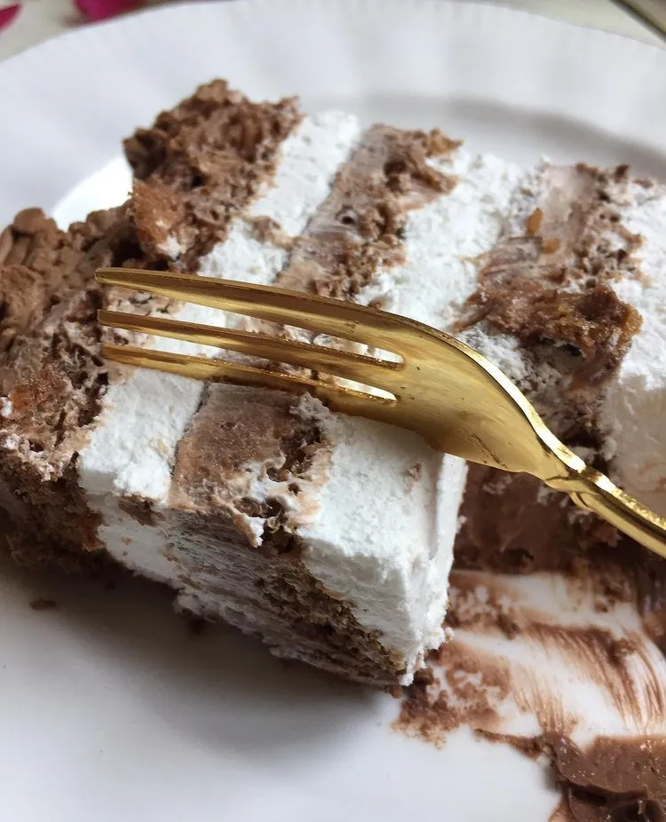 Čokoladni puding krem podelite na četri dela, tako da vam slojevi između korica budu jednaki, a umućenu slatku pavlaku na tri dela (na zadnjoj kori ne ide slatka pavlaka).