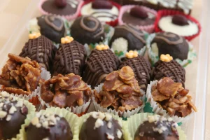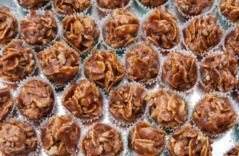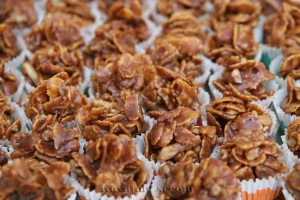 Na tihoj vatri otopiti 8 supenih kašika meda, 200 gr šećera, 150 g čokolade, 1 margarin (250 g). Voditi računa da masa ne provri. Kada se sastojci otope i sjedine, dodati 100 gr seckanih oraha, 100 g suvog grožđa, 250 g pahuljica Corn flakesa. Na tacni poređati papirne korpice i kašičicom ih puniti vrućom masom, ostaviti da se kolačići ohlade i stegnu pre služenja. Iznenadite svoje ukućane jednom lepom, ukusnom i brzom poslasticom…