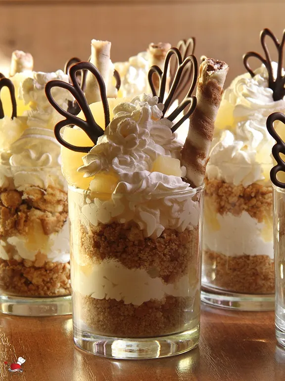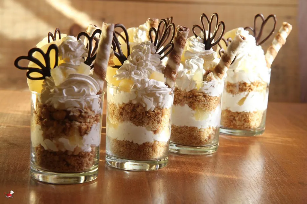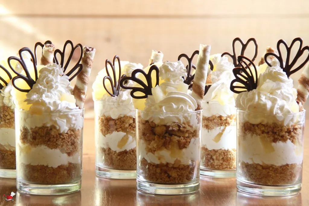 U svakoj čaši prvo dodati po dve kašike mase od pripremljenog keksa, blago je sabiti na dnu, možete upotrebiti kašiku ili manju flašicu uz pomoć koje ćete sabiti keks u čaši (meni je odlično poslužio mali čokanj u tom poduhvatu). Da bi se krem lakše dodao u uskoj čaši može se iskoristiti poslastičarska kesa ili špric, tako će rubovi čaša ostati čisti a krem fino pokriti površinu keksa. Preko krema poređati komadiće ananasa. Ponoviti isti postupak još jednom. Dodati u svakoj čaši po dve kašike keksa i blago ga sabiti ka dnu, vodeći računa da ne pritiskate prejako da keks ne bi izgurao donji deo fila. Dodati još jedan sloj krema i završiti komadićima ananasa. Za dekoraciju upotrebiti po jedan roler i trećinu koluta ananasa.