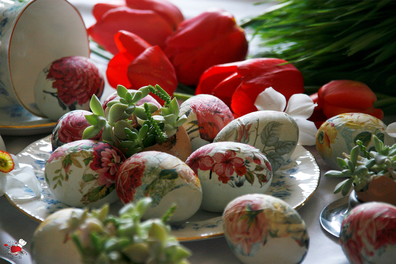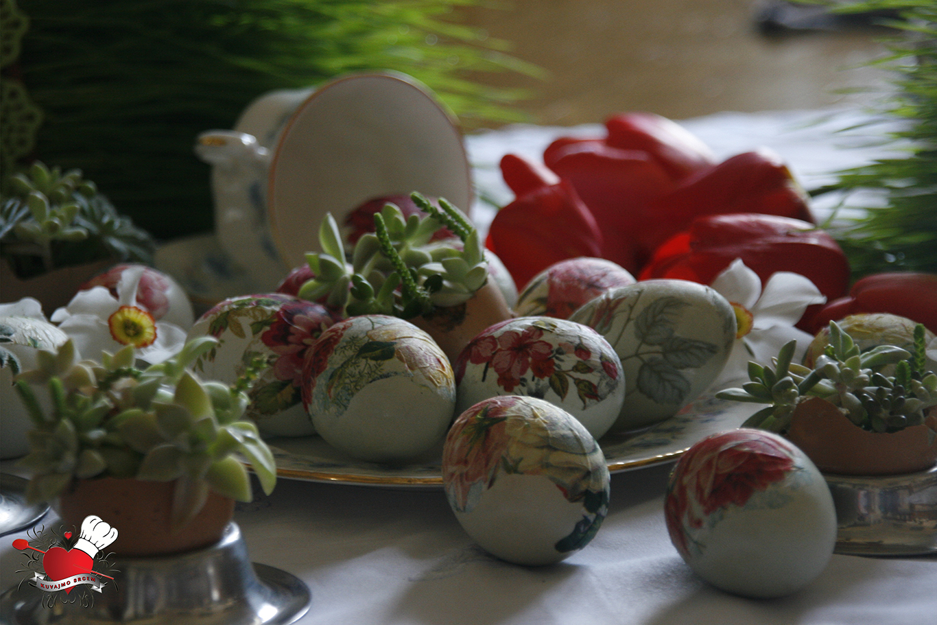 Pune korpe i činije kuvanih jaja u raznim bojama, šarama i dezenima su tih dana svuda oko nas. Svaka domaćica farba prvo jaje u crvenoj boji, koje ostaje u kući do idućeg Uskrsa kao ,,čuvarkuća,,. Kod nas je i ove godine pored tradicionalno farbanih jaja u crvenoj boji, lukovini i listićima raznih biljaka mesto našla i dekupaž tehnika. Deca posebno vole ova mala šarena jaja koja poziraju kao mala umetnička platna. Ne retko ostanu dugo u kući kao dekoracija. I ove godine smo ostali dosledni sebi i pripremili jaja baš onako kako ih deca najviše vole, u raznim bojama…