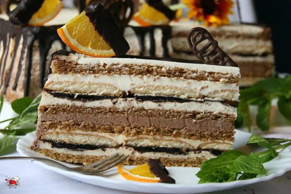 Na prvu koru naneti jedan deo belog fila, jaffa keks blago umakati u sok od pomorandže i složiti preko belog fila koji je okrenut sa čokoladom ka dole, preko jaffa keksa naneti još jedan deo belog fila. Staviti drugu koru i na njoj naneti crni fil, na njemu staviti treću koru na kojoj se opet nanosi jedan deo belog fila, ponoviti postupak sa jaffa keksom i belim filom. Staviti četvrtu koru i naneti ostatak belog fila. Tortu dekorisati otopljenom čokoladom, čokoladnim ukrasima i komadićima pomorandže.