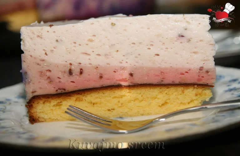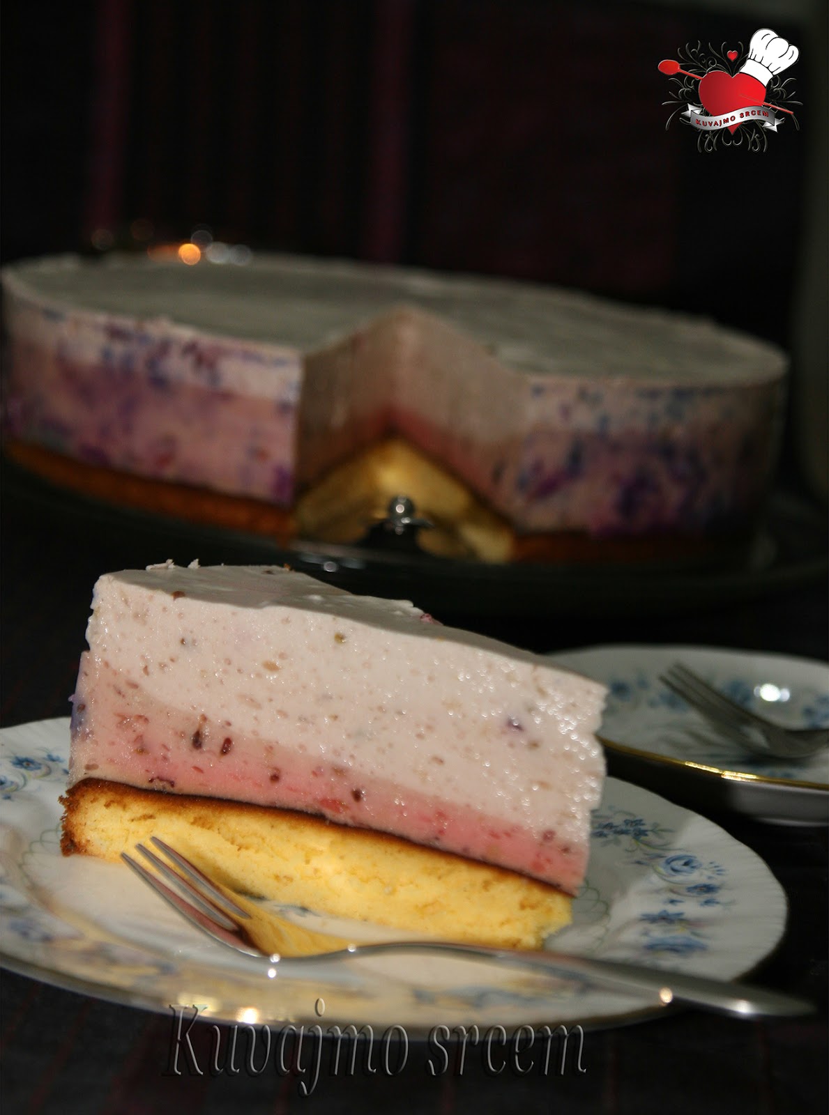 600 ml mleka staviti da provri, posebno rastvoriti 4 pudinga sa 400 ml mleka i 4 kašike šećera. Pripremljen puding postepeno dodati vrelom mleku i ukuvati uz stalno mešanje dok se masa ne zgusne. Od kupina pasiranjem odvojiti koštice i ukuvati voće sa par kašika šećera. Posebno umutiti belance sa šećerom u čvrst sneg i dodavati kašiku po kašiku vrućeg pudinga uz stalno mešanje mikserom na manju brzinu. Fil podeliti na dva dela, u jedan deo dodati 1/3 spremljenih kupina, a u drugi deo dodati 2/3 kupina da se dobije jedan tamniji i jedan svetliji deo krema. Ohlađenu koru poprskati sokom od limuna i naneti tamniji deo krema, preko toga svetliji deo krema takođe ravnomerno naneti, kolač ostaviti u frižider da se dobro ohladi i stegne. Kolač je najbolje pripremiti jedan dan ranije. Sutradan otvoriti ivice kalupa, ukloniti papir sa ivica i kolač prebaciti na tacni za služenje (ostaviti donji deo – dno kalupa). Kolač po želji dekorisati i poslužiti.