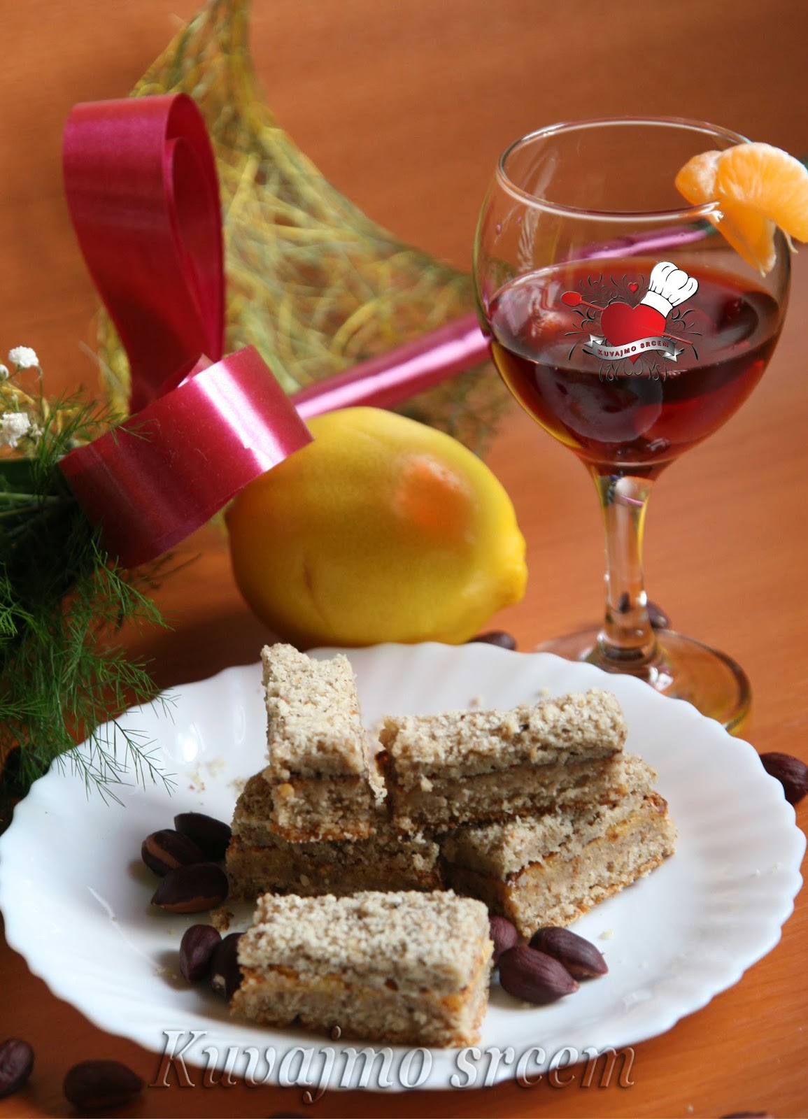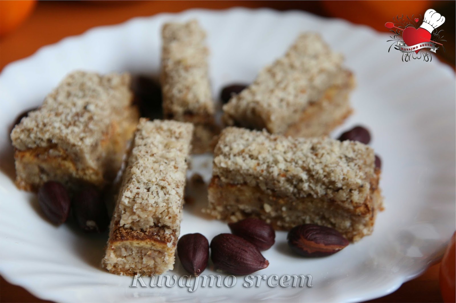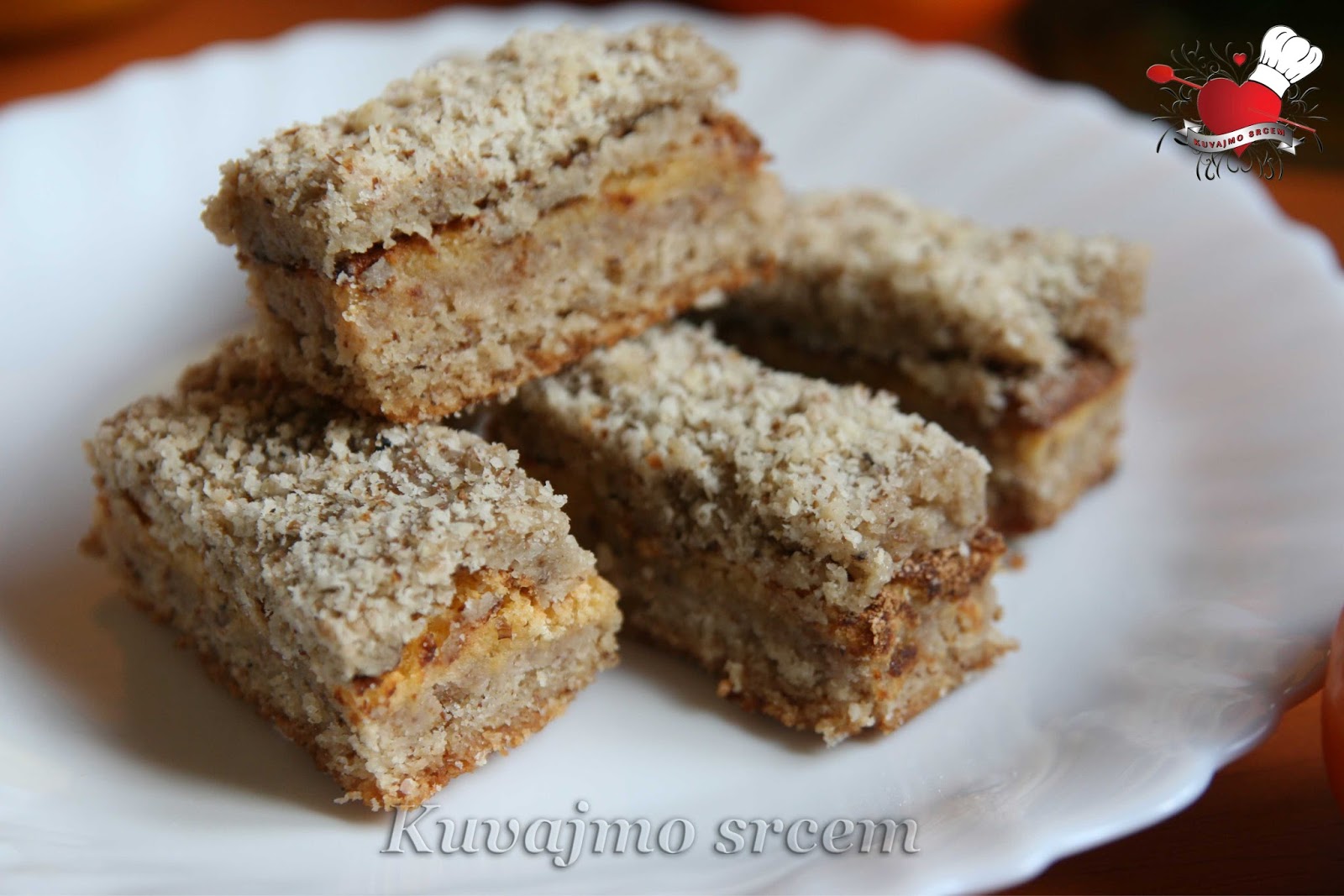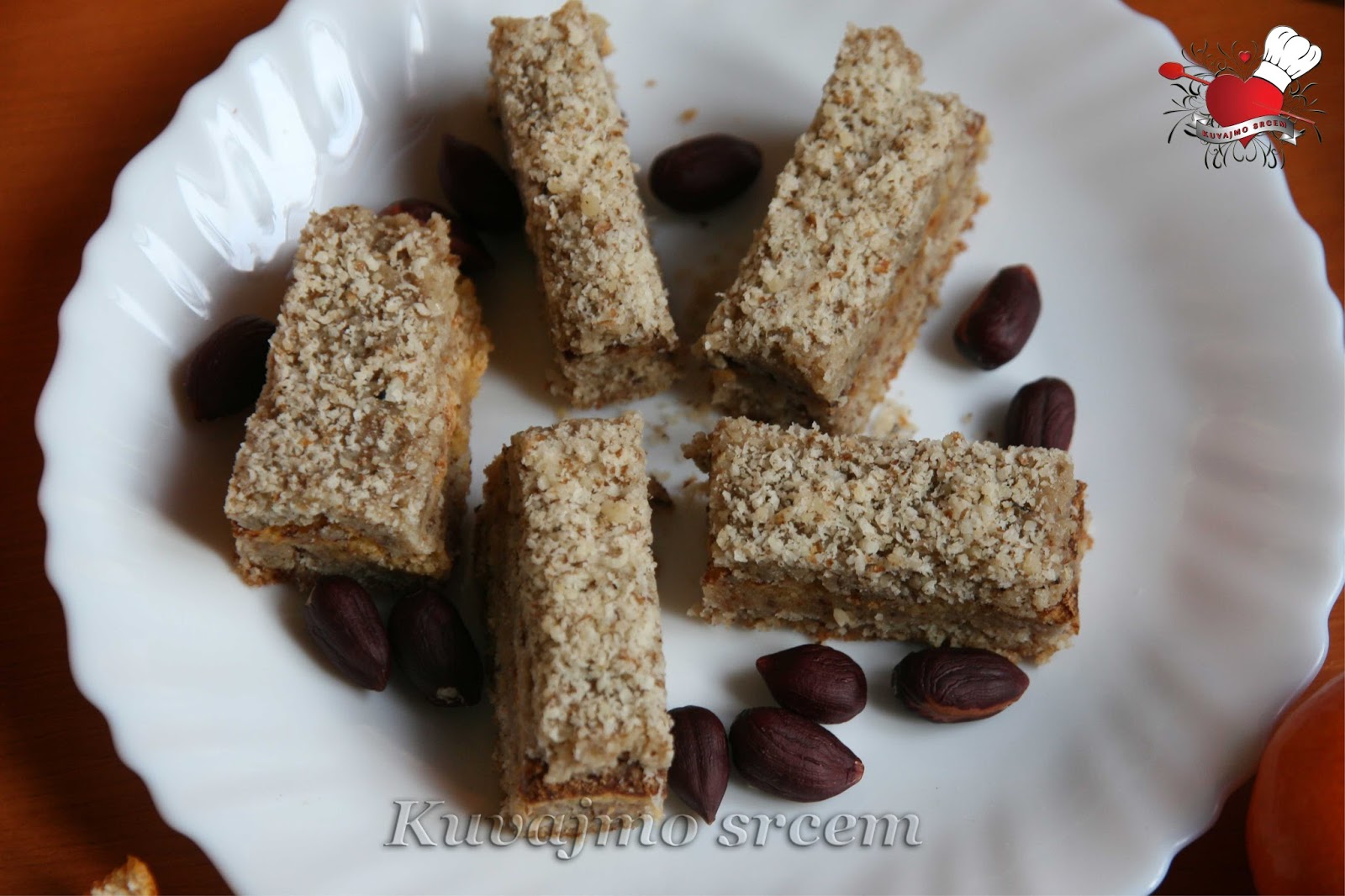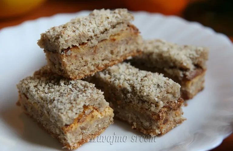 Umutiti margarin sa šećerom, dodati mlevene orahe, brašno i prethodno umućeno belance, zatim sve sjediniti. Masu izručiti u pripremljen pleh (20 x 30) obložen papirom za pečenje i peći u zagrejanoj rerni na 180 – 200 stepeni 20 – 25 minuta u zavisnosti od jačine rerne.