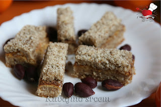 Preko prve kore dodati umućena žumanca sa šećerom u prahu i kašikom brašna, masu lagano preliti preko polu pečenog prvog dela… pleh vratiti u rernu još oko 20 minuta, zatim isključiti rernu i ostaviti kolač na toplom da se još malo suši, u koliko vam se čini da žuta korica nije dovoljno suva ostaviti rernu na 100 stepeni i sušiti kolač još malo, vodite računa da korica ostane žuta.