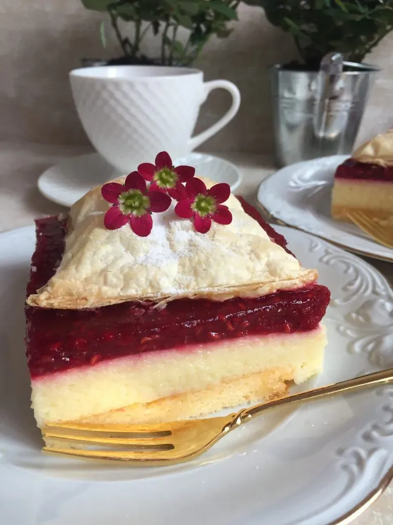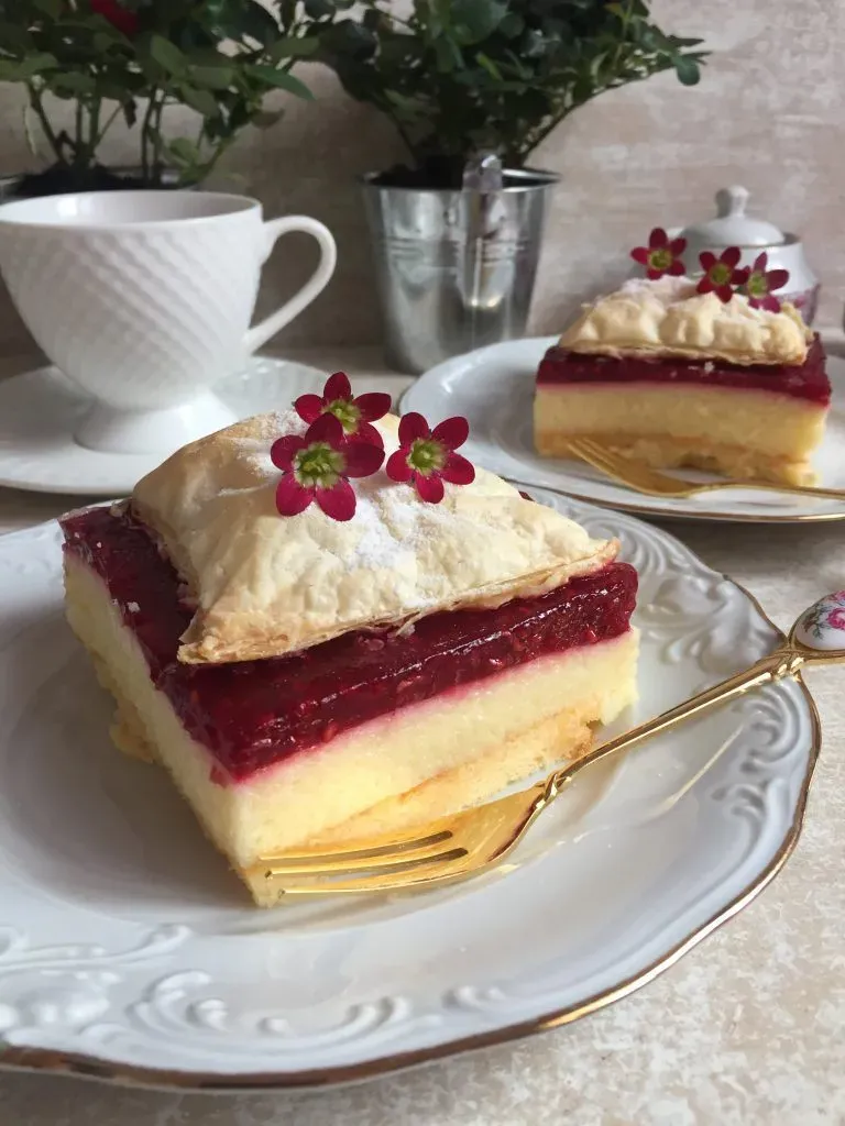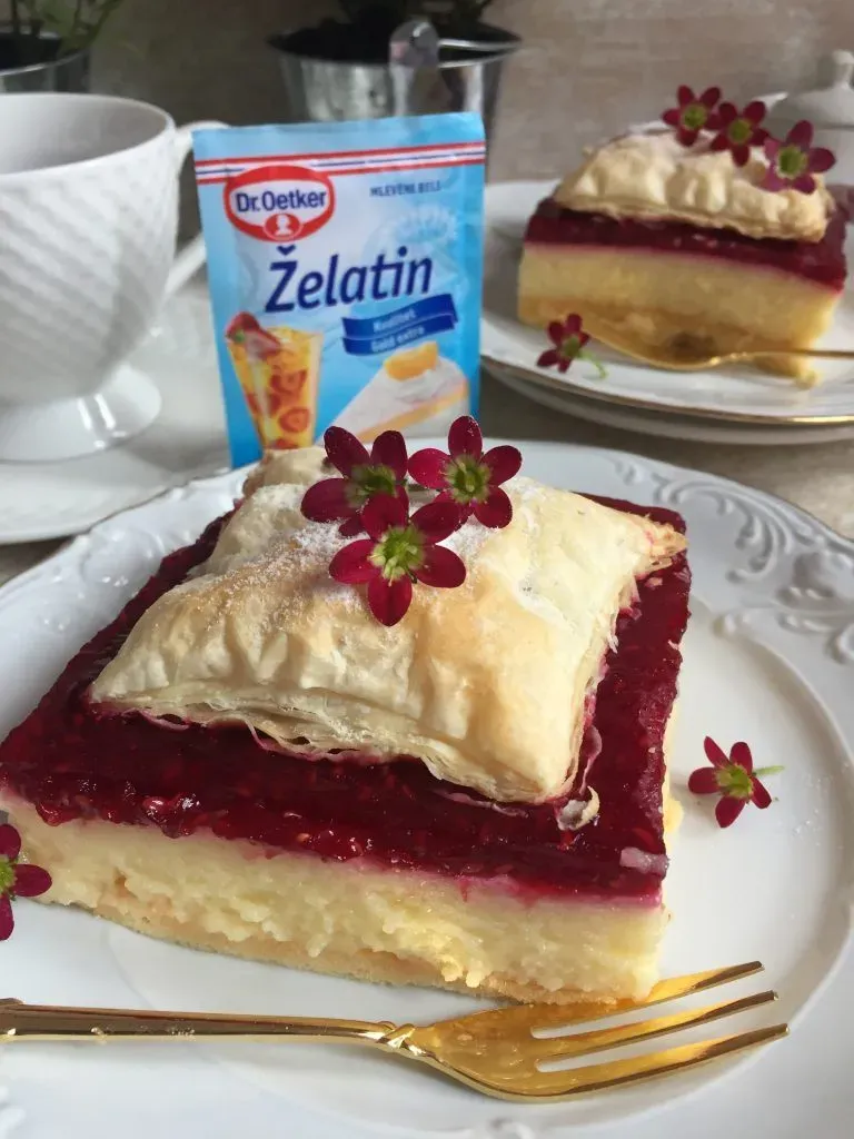 U 4 kašike vode rastvoriti jednu kesicu želatina, 500 g malina staviti u posudu za kuvanje, dodati 50 ml vode i staviti da provri. U vruću masu dodati pripremljen želatin još malo zagrejati i promešati da se želatin fino sjedini sa voćem. Lagano preliti krem od malina preko žutog krema. Ostaviti  da se krem od malina stegne. Kada se krem malo stegne nakon par sati poređati kocke od lisnatog testa,  krempitu preko noći ostaviti u frižider da se fino ohladi i kremovi stegnu.