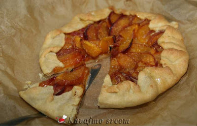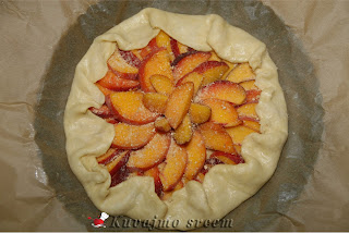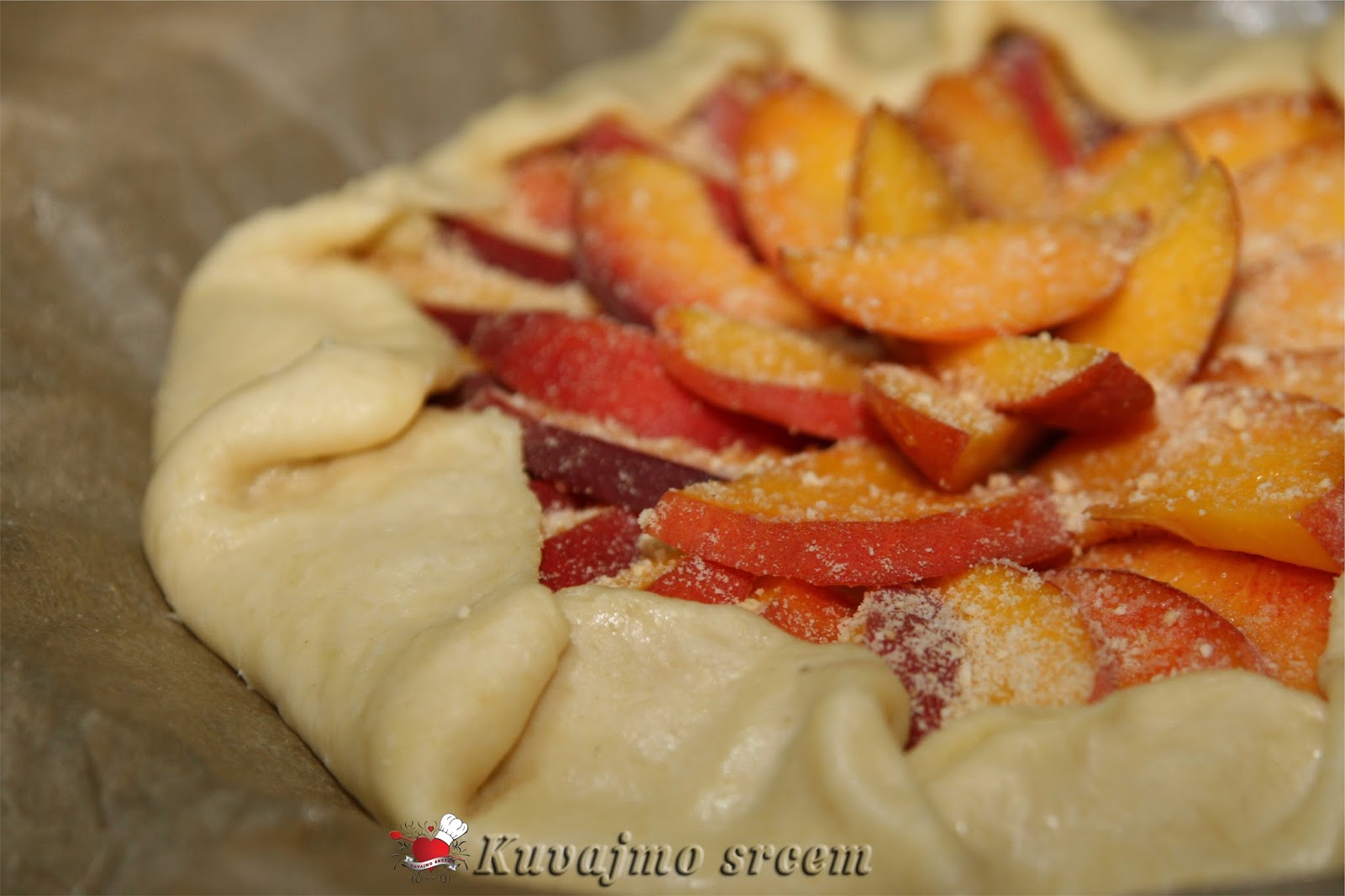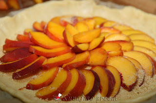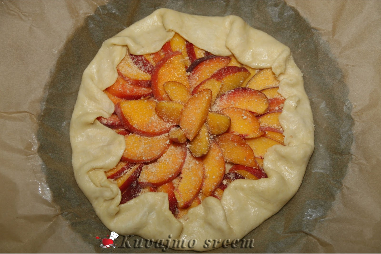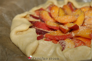 Na pripremljenu koru, posuti malo mlevene plazme, složiti pripremljene breskve, ređajući ih u krug uz ivicu kalupa. Posuti ostatkom šećera i mlevenog keksa, ivice testa saviti ka sredini pleha da pokriju jedan manji deo poređanog voća. Peći u zagrejanoj rerni na 180 – 200 stepeni oko 20 – 30 minuta (u zavisnosti od jačine rerne) dok testo blago ne porumeni, a voće smekša. Pečenu krostatu ostaviti da se malo ohladi, posuti blago prah šećerom, iseći na 8 jednakih delova i poslužiti.