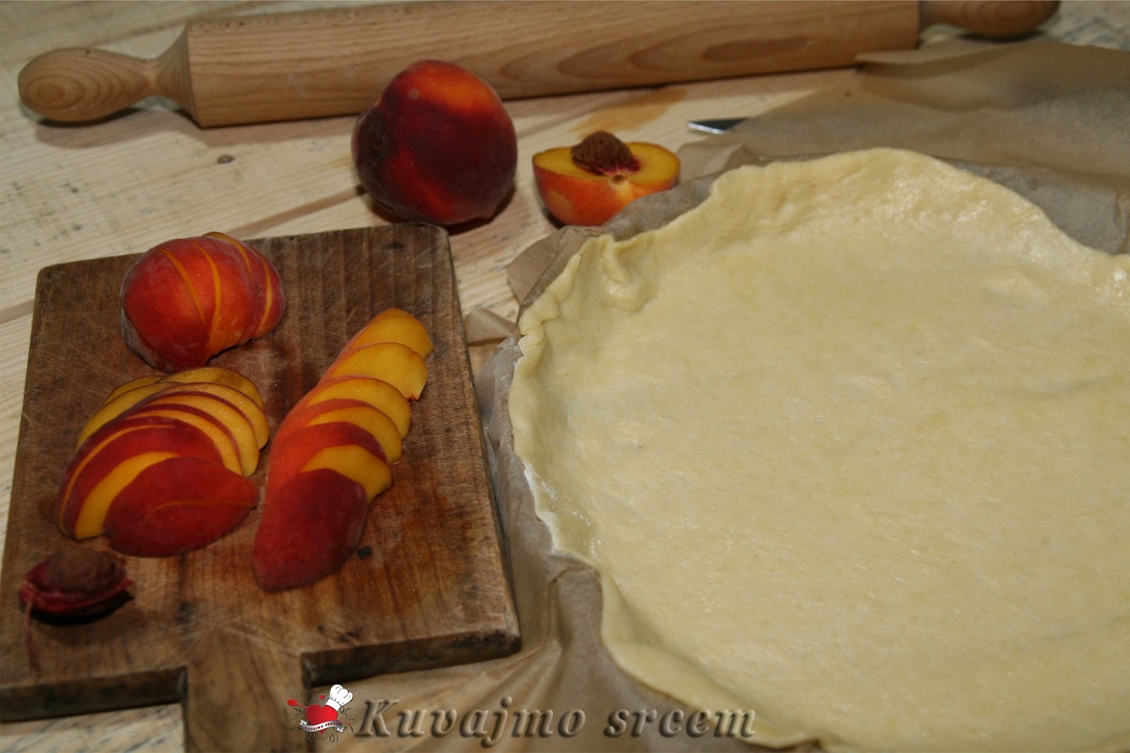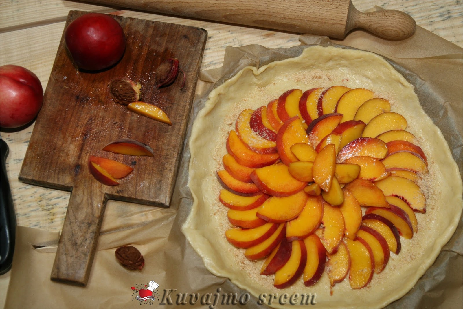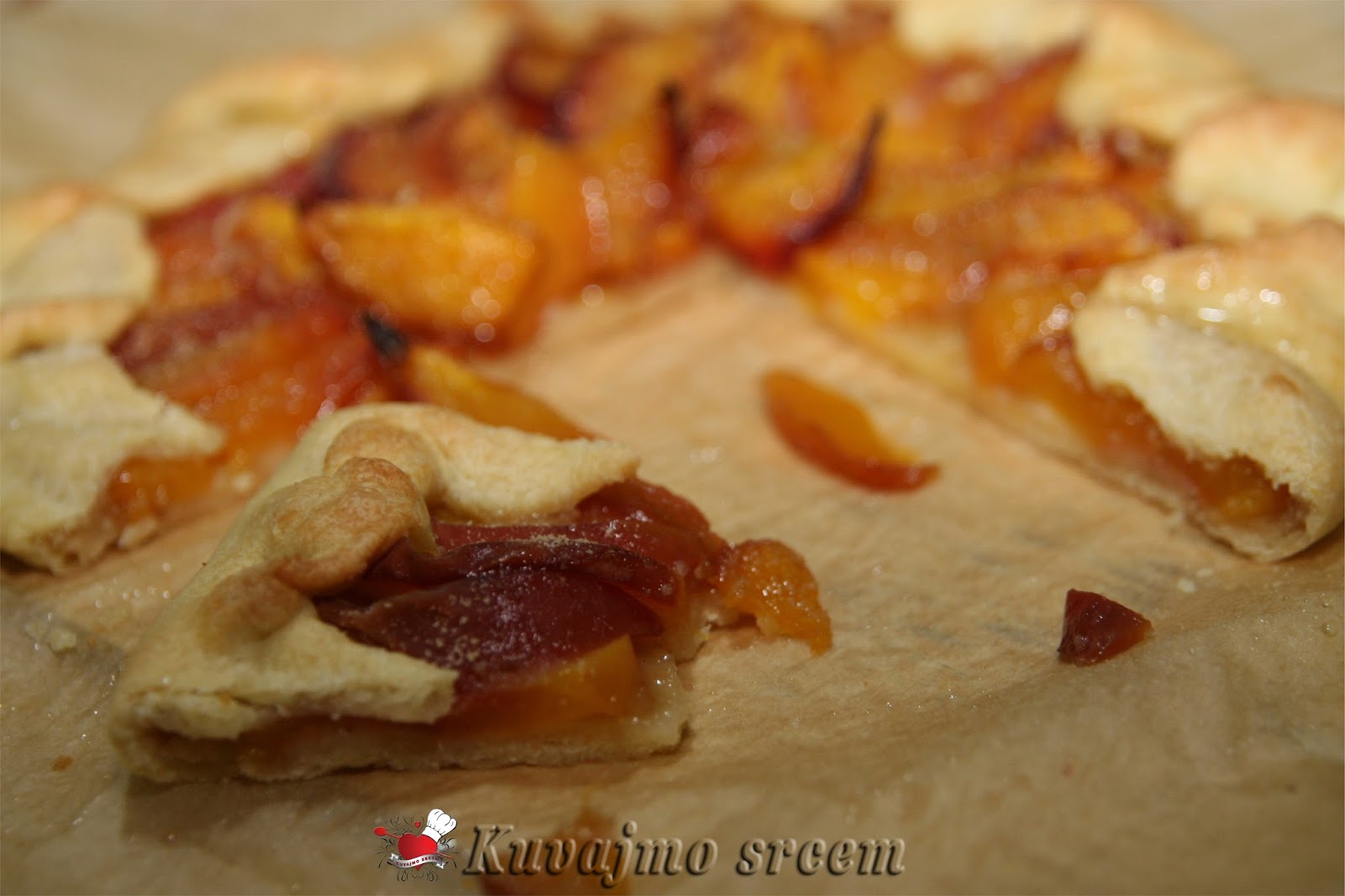 Na pripremljenu koru, posuti malo mlevene plazme, složiti pripremljene breskve, ređajući ih u krug uz ivicu kalupa. Posuti ostatkom šećera i mlevenog keksa, ivice testa saviti ka sredini pleha da pokriju jedan manji deo poređanog voća. Peći u zagrejanoj rerni na 180 – 200 stepeni oko 20 – 30 minuta (u zavisnosti od jačine rerne) dok testo blago ne porumeni, a voće smekša. Pečenu krostatu ostaviti da se malo ohladi, posuti blago prah šećerom, iseći na 8 jednakih delova i poslužiti.
