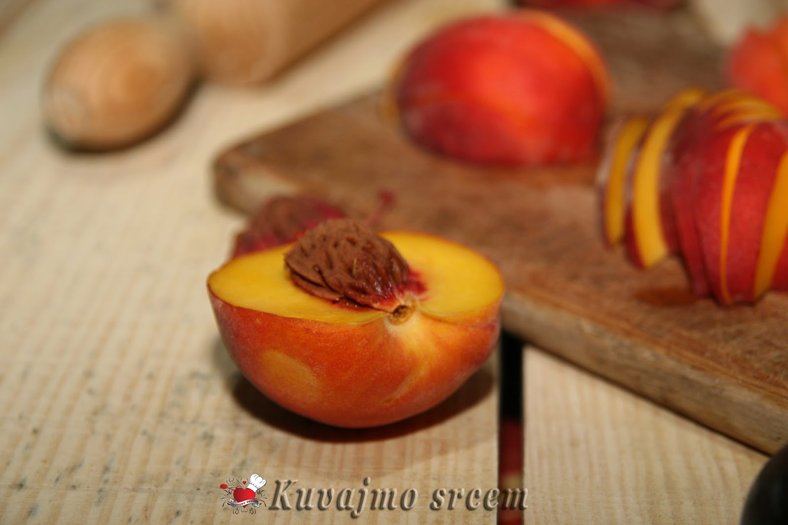 Zrele čvrste breskve oprati, preseći na pola, odstraniti košticu i iseći na manje kriške, posuti ih blago šećerom, vanilin šećerom i ostaviti desetak minuta…