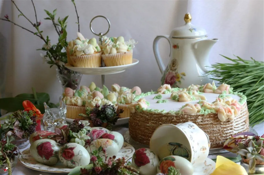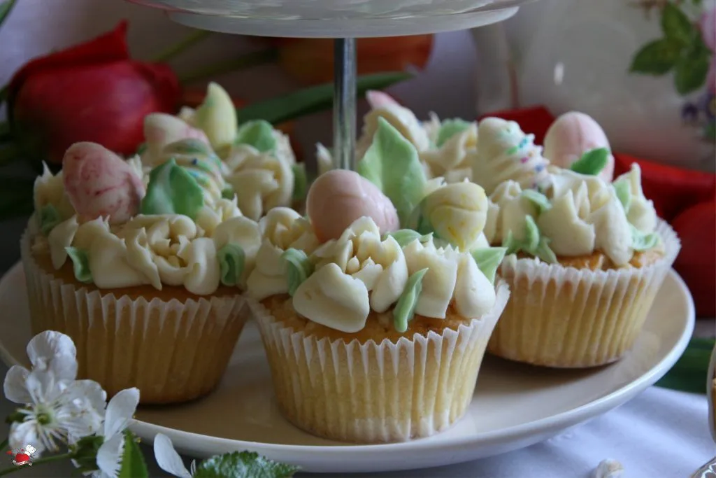 Odvojiti 3 – 4 kašike belog ganaš krema i dodati malo zelene boje za listiće. U kesi za dekoraciju za odabranim nastavkom, staviti beli ganaš. U drugoj kesici sa nastavkom za listiće staviti zeleni ganaš. Mafine dekorisati po želji, ja sam koristila 3 D nastavak sa motivom ruže, i mali nastavak za listiće. Na ganaš krem rasporediti čokoladna jaja i veće čokoladne listiće. Dobro ohladiti i poslužiti.