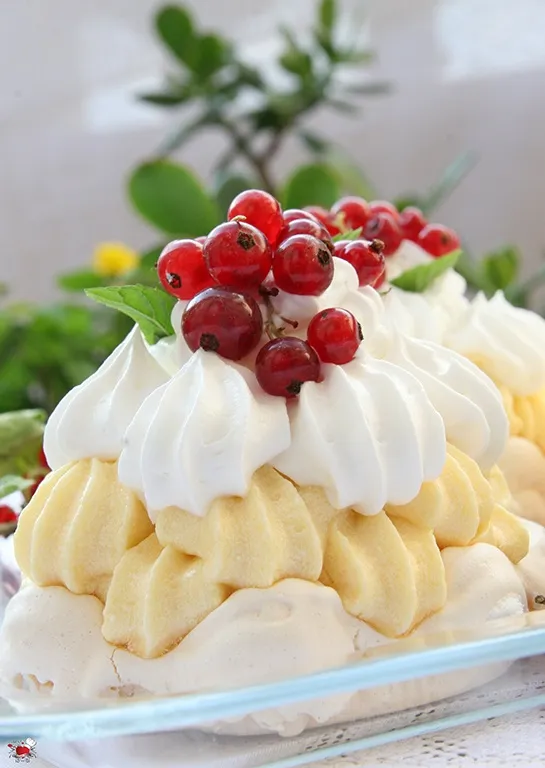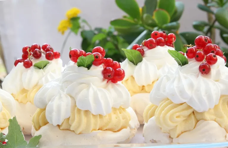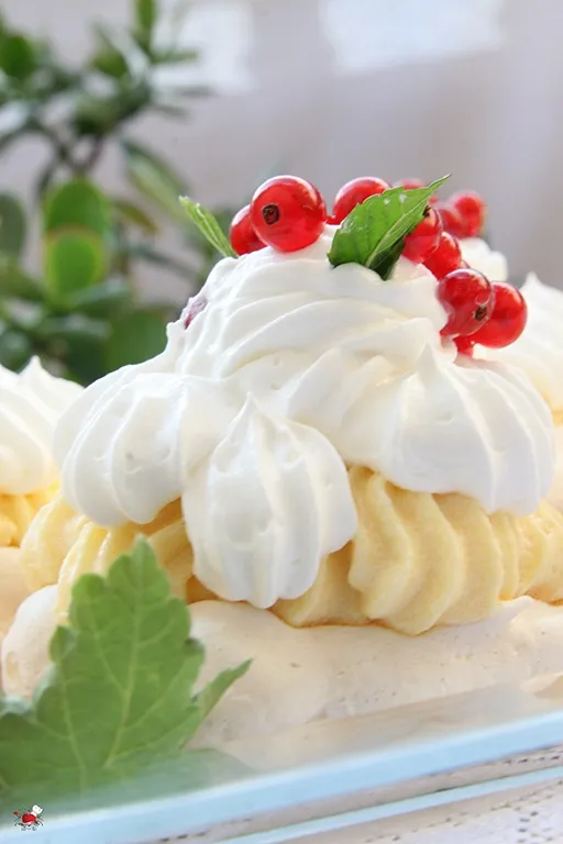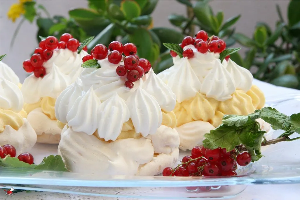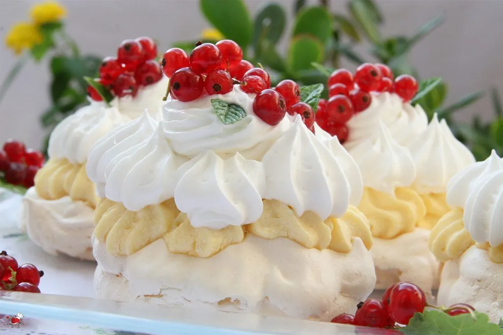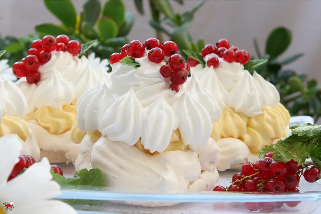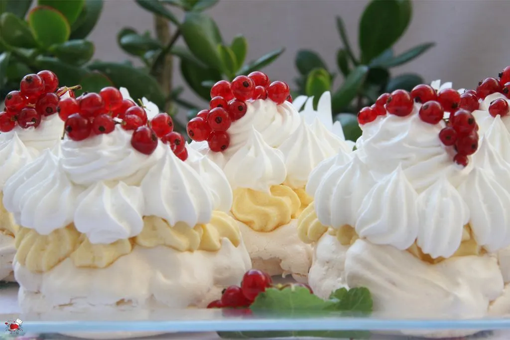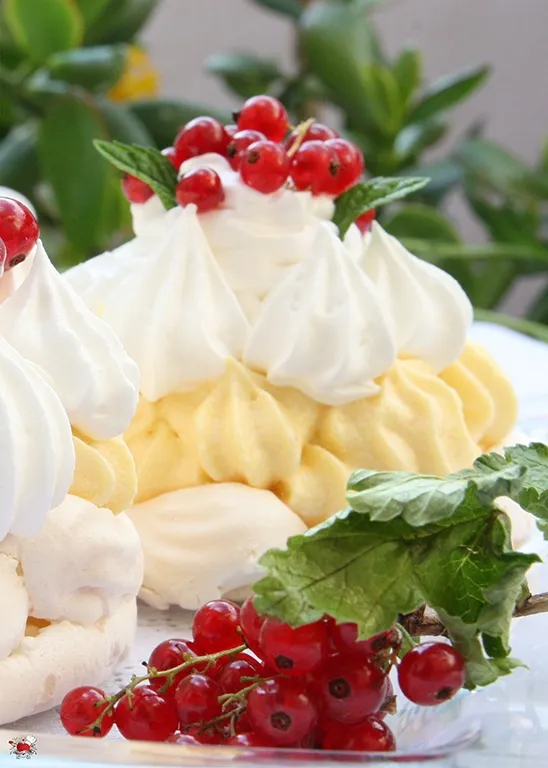 Posebno umutiti slatku pavlaku sa prah šećerom. Žuti krem staviti u špric ili dresing kesu i filovati beze korice. Isti postupak ponoviti i sa slatkom pavlakom, koja se pažljivo nanosu preko žutog krema. Mini pavlove dekorisati svežim ribizlama ili nekim drugim voćem po vašoj želji. Sveži listići mente doneće celoj priči jednu posebnu i divnu aromu.