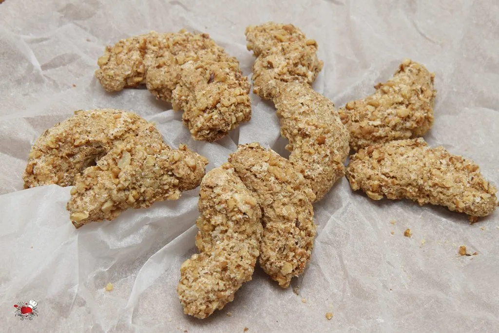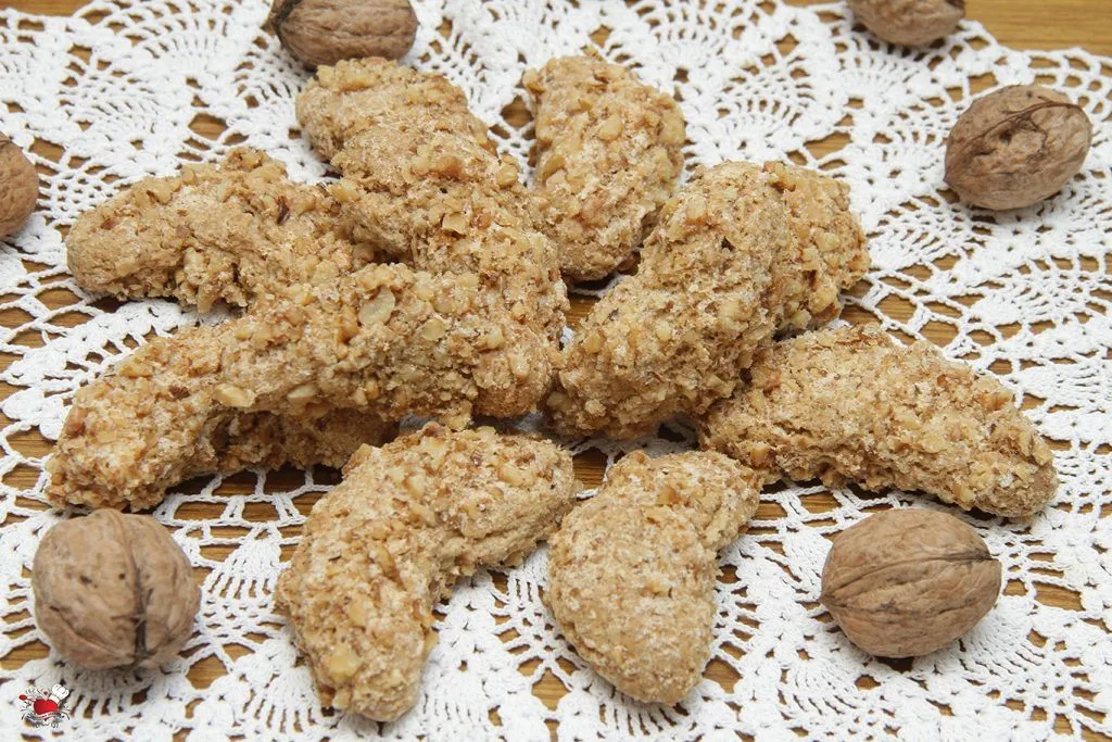 Napraviti valjuške ili polumesece od sastojaka iz prve posude. Odmah ih umakati u pripremljena belanca (zanemarite ulepljene prste), na kraju ih treba dobro uvaljati u mešavinu seckanih oraha i kristal šećera.