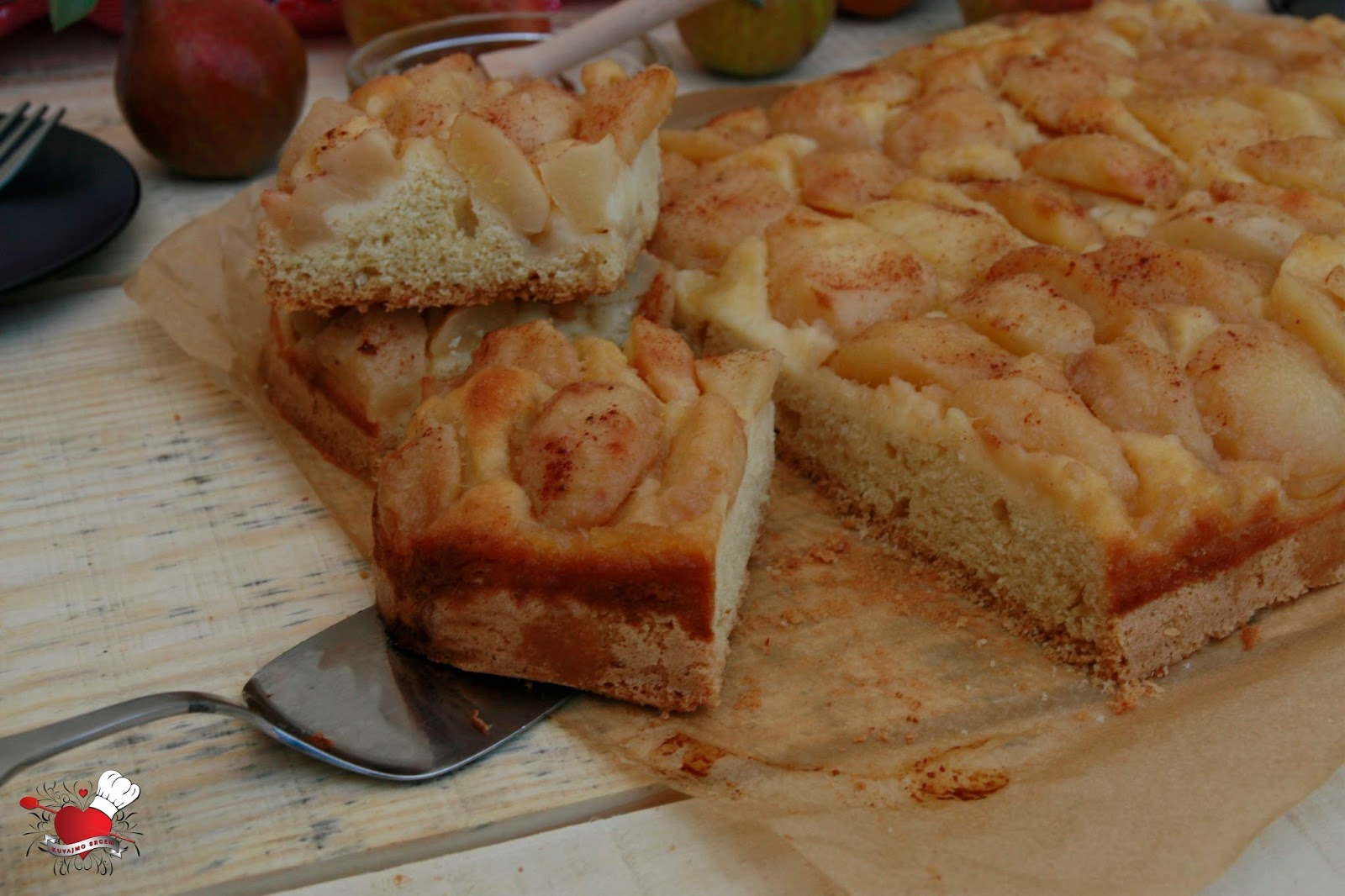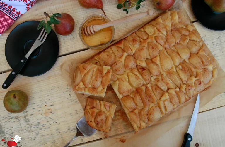 Sasvim jednostavna poslastica od testa i voća koja se priprema od dostupnih sastojaka, one koje svako od nas ima u kući. Malo brašna, putera ili margarina, šećera, jaja, mleka i neko voće. Šta više poželeti, već ušetati u kuhinju sa osmehom na licu i željom da se obraduju ukućani potpuno jednostavnom voćnom poslasticom. Volim pripremiti desert sa uživanjem, onako opušteno bez frke u žurbe kad nije potrebna specijalna kupovina i traženje nekih posebnih namirnica i sastojaka. A priprema jednostavna, prosto lagana, toliko da je može pripremiti i svaki početnik u kuhinji. Jednostavan kolač, koji za osnovu ima mekanu koricu, gde dominira ukus pečenog testa kao i kriške sočne domaće kruške.