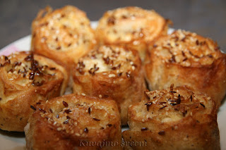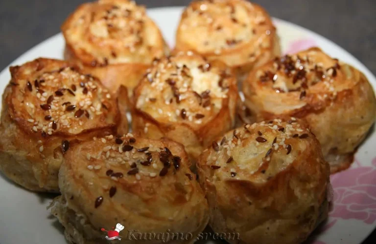 Umutiti jaja sa jogurtom, uljem i praškom za pecivo, dodati griz. Od 1/2 kg kora trebalo bi umotati tri rolata. Kore razdvojiti i podeliti u tri jednaka dela. Pripremljenim filom četkicom mazati kore i ređati ih jednu preko druge, na zadnjoj 5 ili 6 kori (u zavisnosti od debljine samih kora) preko fila dodati sitan sir. Sve kore lepo umotati u rolat, iseći i poređati u pripremljen pleh, preliti svako parče po sredini ostatkom fila, dodati laneno seme i susam. Pitu peći na 180 stepeni oko 15 minuta u zavisnosti od jačine rerne…