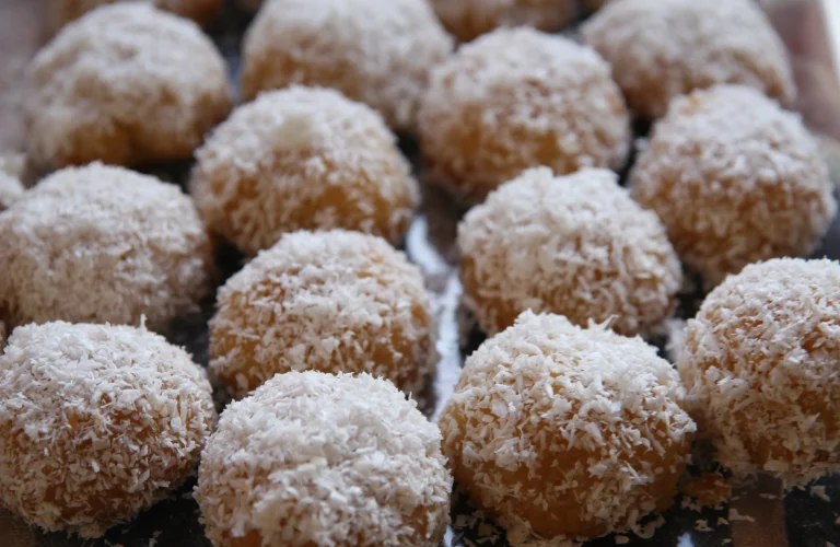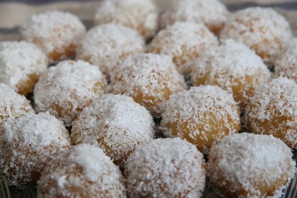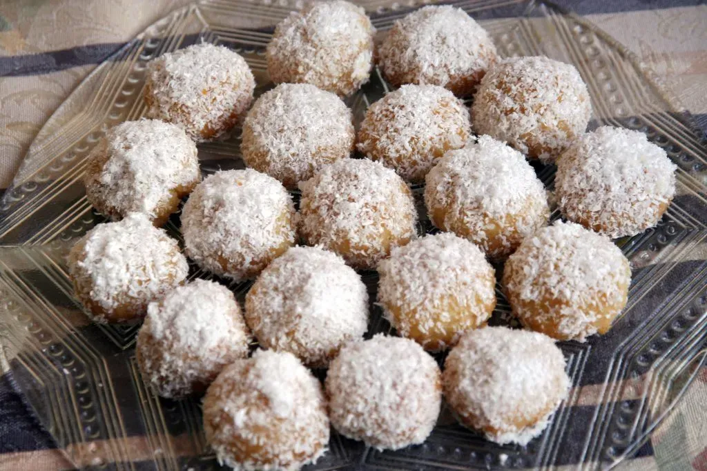 Vruće kuglice prelijte pripremljenim šerbetom, ostavite ih desetak minuta da fino upiju, izvadite ih na tacni i pospite kokosom ili mlevenim orasima po želji. Mi više volime ovu varijantu sa kokosom.