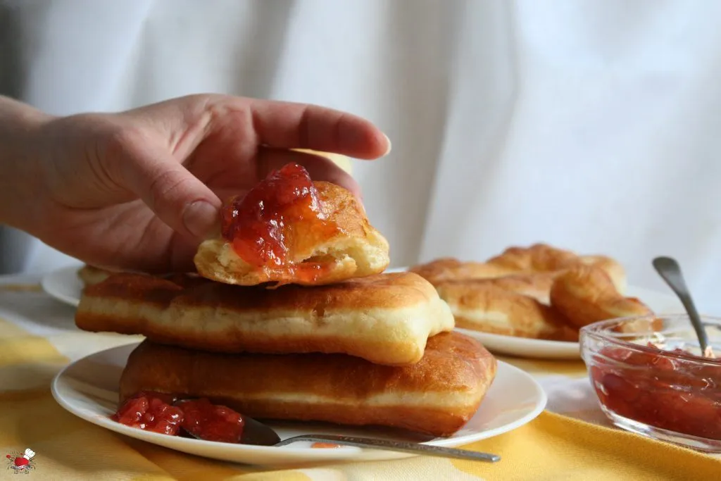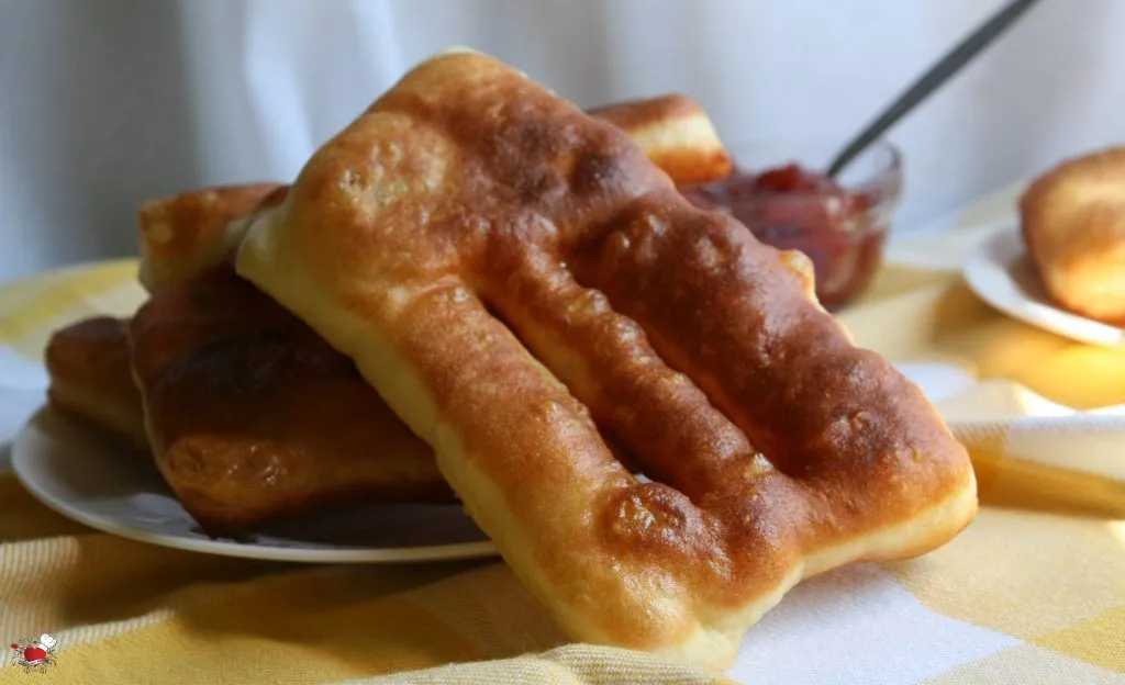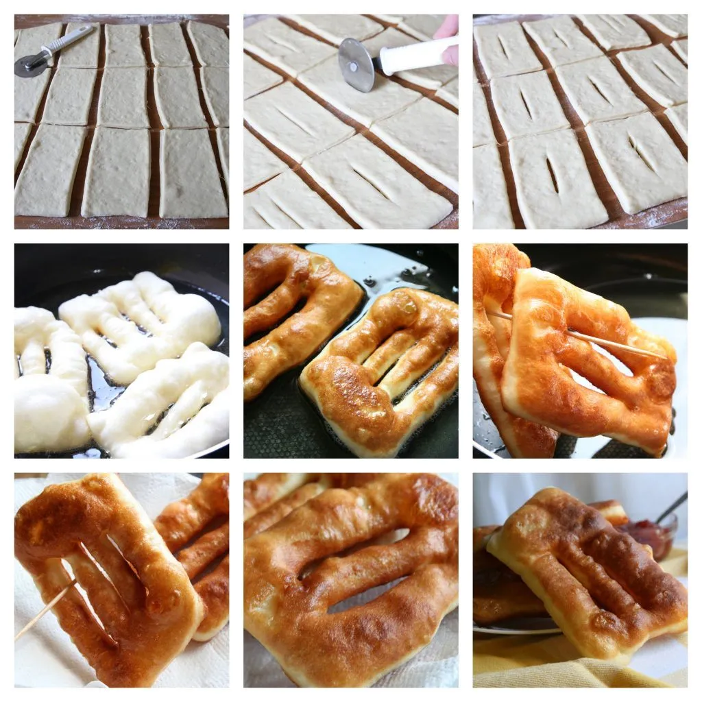 U 50 ml mlakog mleka staviti kvasac, kašičicu šećera i ostaviti da se kvasac aktivira. U posudu sa brašnom dodati so, pripremljen kvasac, ostatak mleka, jogurt i jaje, zamesiti fino glatko testo. U koliko vam se čini da je testo tvrđe po potrebi dodajte još par kašika mleka. Testo fino umesiti i pokriti ga providnom folijom, ostaviti ga 30 – 40 minuta na toplom da testo naraste. Pripremljeno testo staviti na pobrašnjenu površinu i istanjiti na debljinu od pola centrimetra. Oštrim nožem ili sekačem za picu iseći pravougaonike 10 x 5 cm, na svakom pravougaoniku od testa napraviti rez na sredini, koji se blago otvara prstima pre pečenja. Tako razvučeno testo ostaviti pokriveno da odmara još desetak minuta. U međuvremenu u širu posudu sipati veću količinu ulja (oko 1 l) i zagrejati ga. U zagrejano ulje pržiti testo dok lepo ne porumeni. Pržene mekike stavljati na papirni ubrus kako bi pokupio višak masnoće.