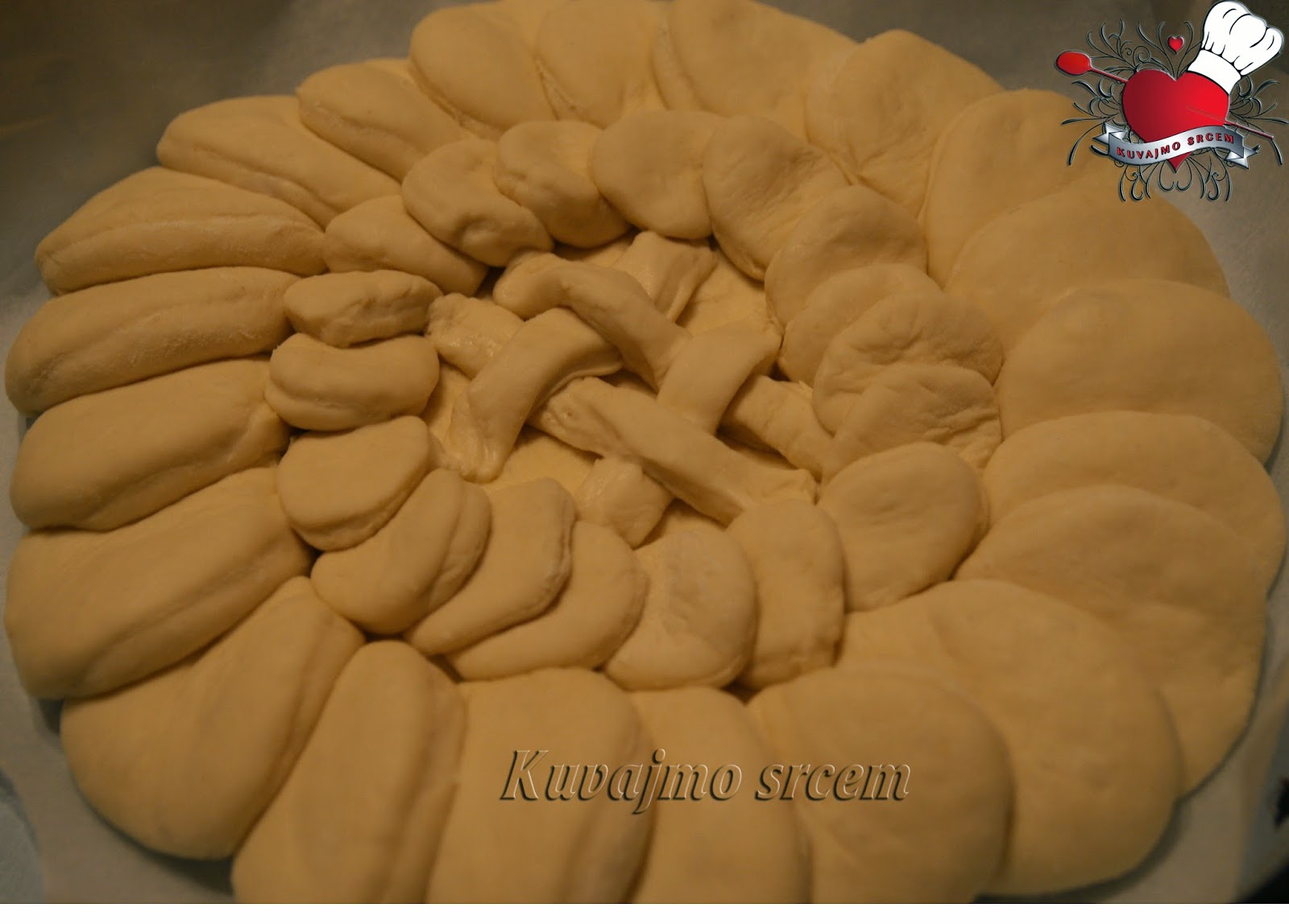 U odgovarajućoj posudi staviti veći deo brašna, dodati so, već pripremljen kvasac, ostatak mleka, vodu i  ulje, zamesiti glatko testo, ostaviti oko 30 minuta da odmara i naraste. Pripremiti odgovarajuću tepsiju (br 30 – 32)  obložiti je papirom za pečenje. Naraslo testo staviti na pobrašnjenoj površini, malo premesiti i istanjiti oklagijom na debljinu od 6 – 7 mm. Okruglom modlom koju treba zasoliti brašnom vaditi krugove od testa.  Krugove od testa slagati prvo uz ivicu tepsije da svaki naredni krug preklopi 2/3 prethodnog kruga, potom na sredinu tepsije stavite manji deo testa, a ostatak tepsije popunite krugovima koje treba vaditi modlom manjeg obima od prethodne i ponoviti postupak sa ređanjem kolutova od testa. Celu pogaču premazati umućenim jajetom po želji dekorisati zrnevljem i ostraviti da pogača naraste oko 30 minuta.