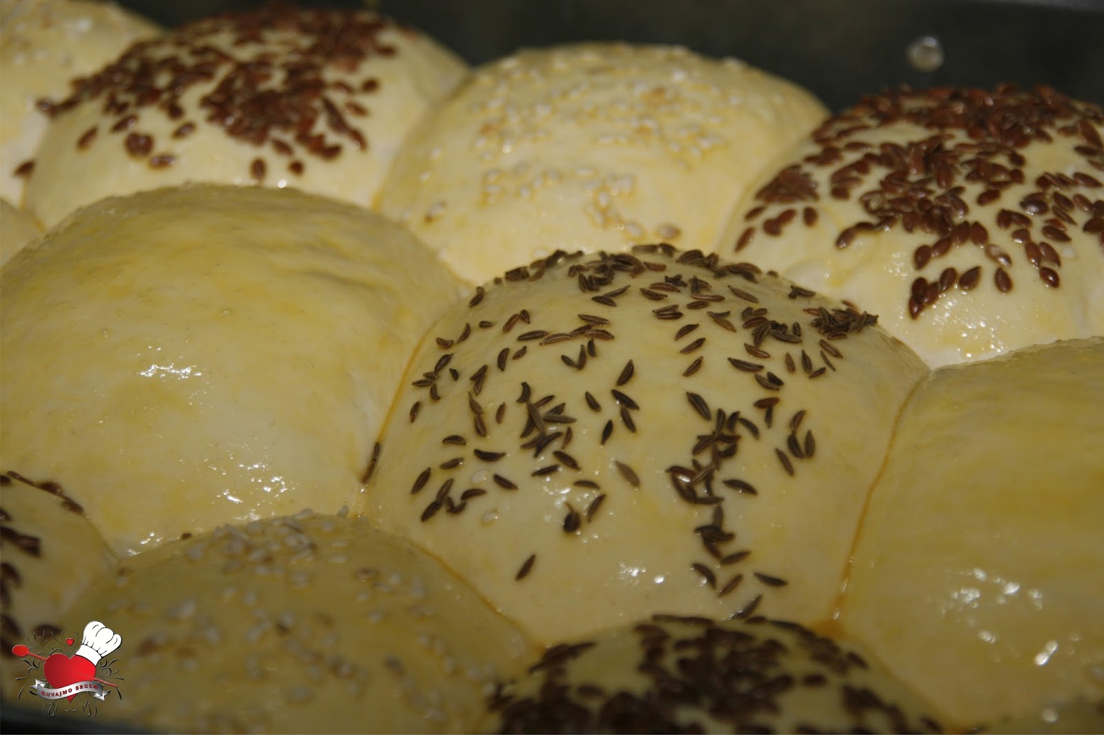 Za premazivanje pogače, umešati 1 jaje i 1 kašiku ulja, četkicom namazati pogaču. Pogačice naizmenično posuti semenkama lana, susama i kima. Pogaču peći u prethodno zagrejanoj rerni na 220 stepeni (u zavisnosti od jačine rerne korigovati temperaturu u toku pečenja) sve dok ne dobije zlatno bakarnu boju.