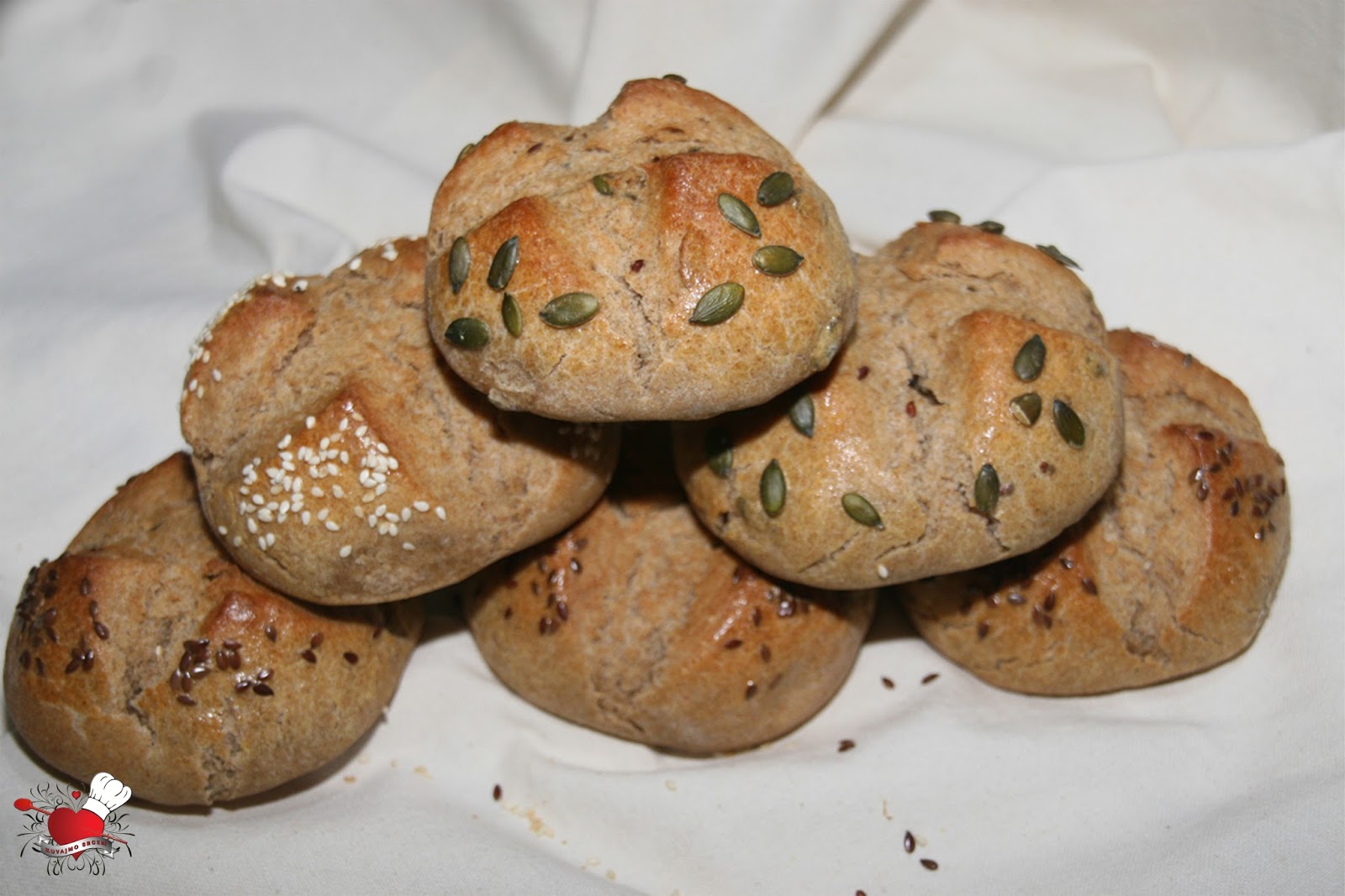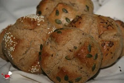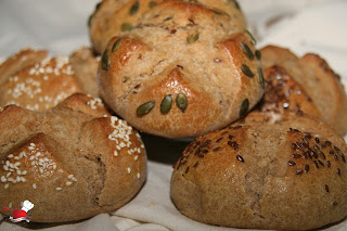Naraslo testo prebaciti na pobrašnjenu podlogu, podeliti ga na 8 – 10 deset manjih loptica (veličinu pogačica odredite sami). Pogačice poređati u pleh na papir za pečenje sa dovoljno prostora između njih. Pokriti ih providnom folijom ili pamučnom salvetom i ostaviti ih oko 30 minuta da odmore i malo narastu. Za premaz pogačica pripremiti 1 jaje izmešano sa malo vode. Premazati pogačice i oštrim nožem po sredini testa napraviti rez u obliku slova x. Posuti ih zrnevljem i peći u prethodno zagrejanoj rerni na 180 – 190 stepeni oko 15 – 20 minuta u zavisnosti od jačine rerne. Pogačice poslužiti kao dodatak obroku ili uz slatki ili slani namaz. To već odaberite sami po svojoj želji i potrebi.