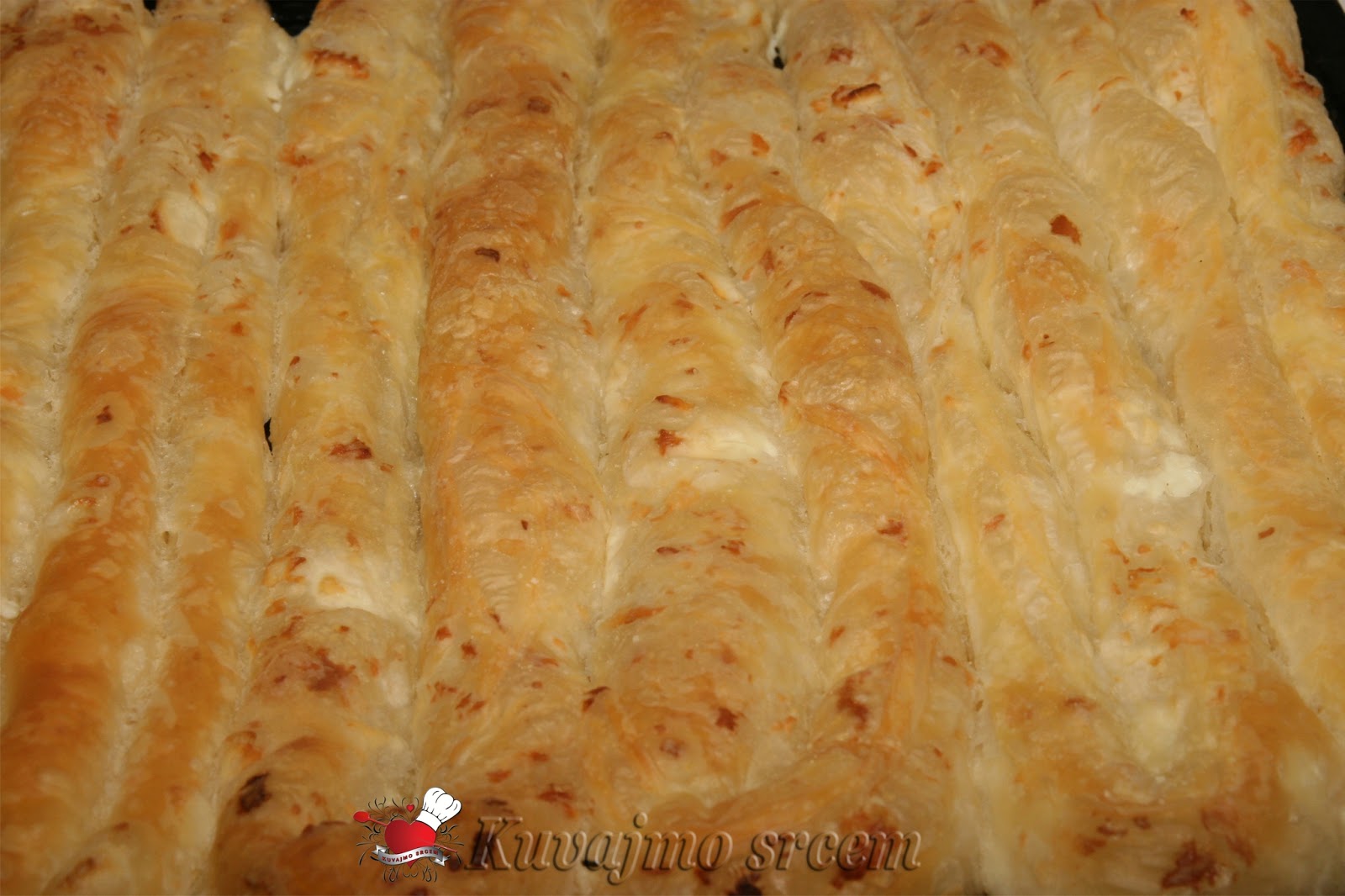 Zamesiti testo od brašna, kašičice soli i vode. Testo ostaviti da stoji 10 – 15 minuta. Testo podeliti na 4 dela (pogačica) premazati ih uljem i ostaviti da odstoje 20 – 25 minuta. Na pamučnom stoljnjaku (koji služi samo u te svrhe… znaju ostati fleke od ulja) kojim je prekriven sto, razvučemo koru lagano prstima u krug sve dok se testo ne istanji preko ivice stola (dobro bi bilo da je oko stola slobodan prostor i da se može ići oko njega) i ne dobije tanka kora, deblje krajeve iseći nožem tako da Vam ostane samo tanki deo kore. Na koru posuti masu od isitnjenog sira i poprskati uljem, uz pomoć stoljnaka saviti prvo ivice sa dve suprotne strane, zatim uz pomoć stoljnjaka urolati koru. Koru lagano preneti u pouljen pleh ili tepsiju i po želji ih slažiti motajući ih u krug ili ređajući pravo jednu do druge. Postupak ponoviti i sa ostalim korama. Pitu peći u prethodno zagrejanoj rerni na 200 c oko 20 minuta (u zavisnosti od jačine rerne) dok pita ne dobije lepu boju. Pitu poslužiti vruću uz jogurt ili kiselo mleko….