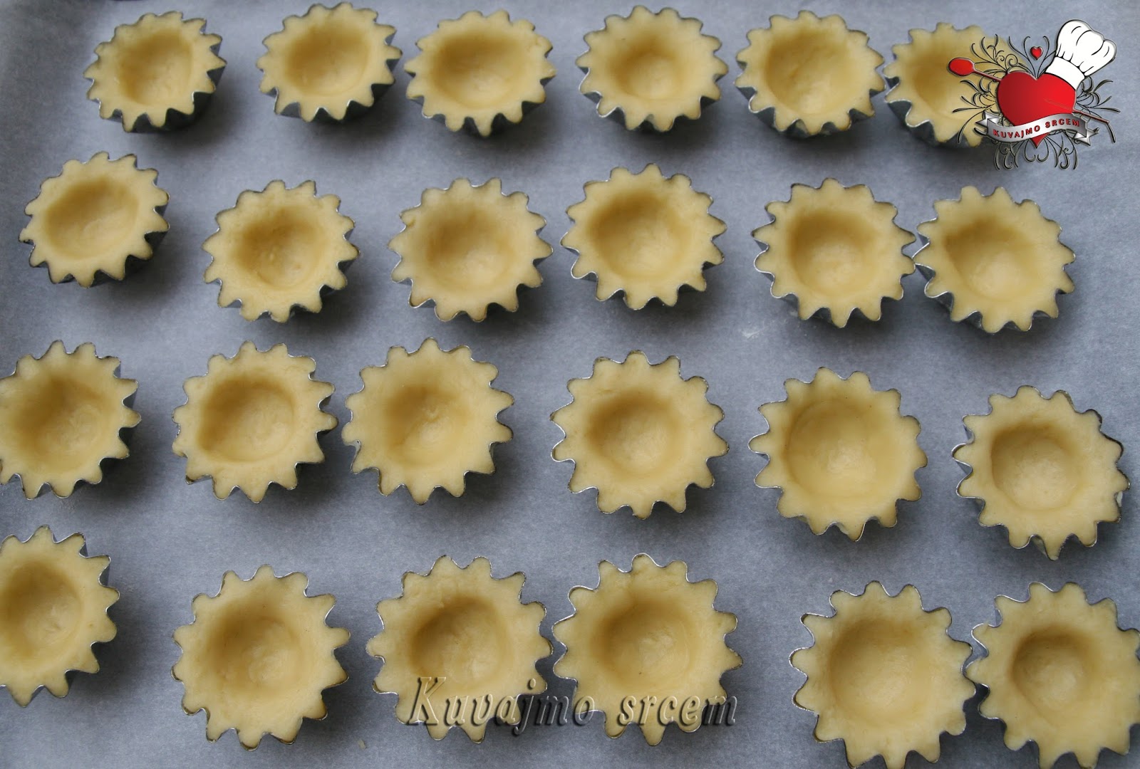 Od pomenutih sastojaka umesiti glatko testo. Praviti male kuglice i svaku utisnuti u metalne modlice. Peći na 160 stepeni desetak minuta (u zavisnosti od jačine rerne) voditi računa da testo ostane svetlije boje. Ohlađene korpice puniti pripremljenom masom i ukrasiti po želji…