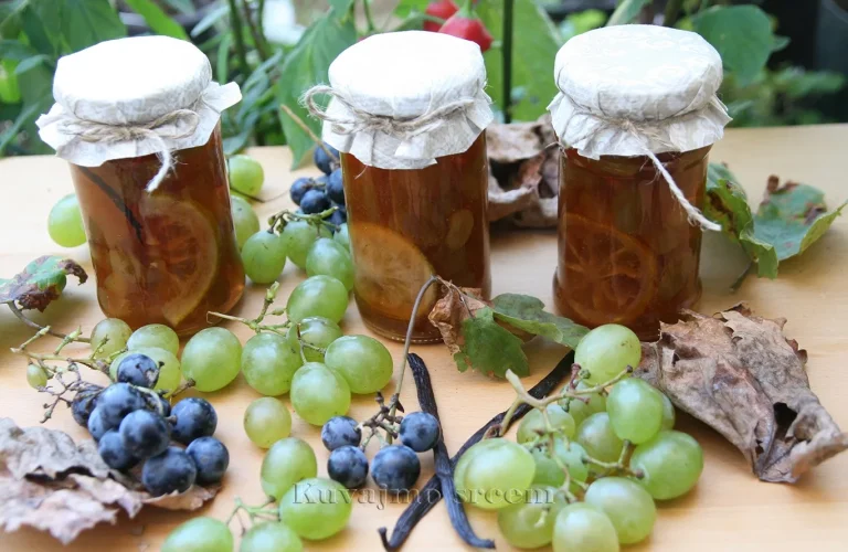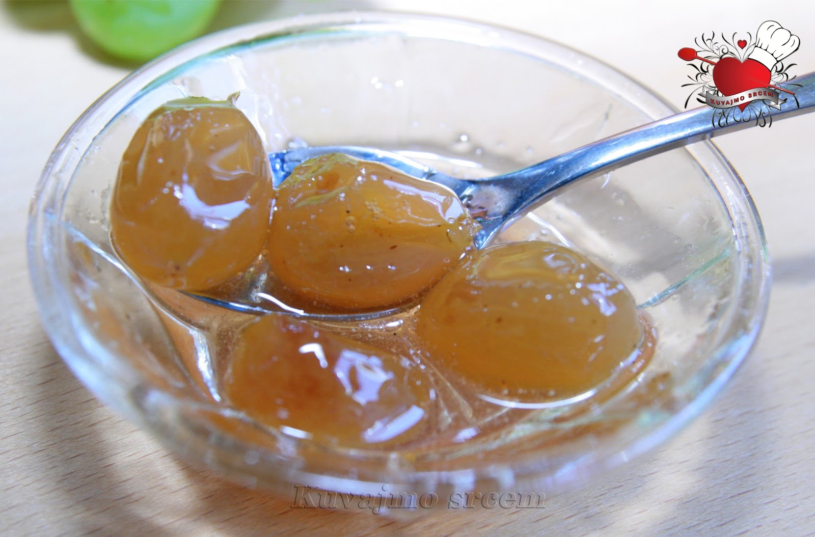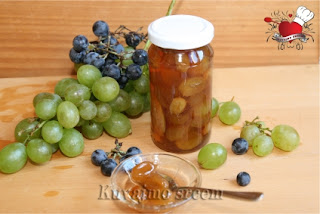 Grožđe temeljno oprati uranjanjem grozdova u vodu, koju je potrebno menjati nekoliko puta, da bi sva nečistoća sa zrna bila uklonjena. Pripremljene grozdove ocediti od višak tečnosti, zrna pažljivo skinuti sa peteljki. U široj posudi za kuvanje staviti šećer i vodu i na tihoj vatri ukuvati sirup. Kuvanom sirupu dodati zrna grožđa i nastaviti kuvanje, povremeno sa površine ukloniti penu i koštice iz zrna u koliko ih ima. Posudu sa slatkom ne mešati, već povremeno protresti posudu i na taj način pomerati zrna po sirupu da se ravnomerno kuvaju. Pred kraj kuvanja dodajte kriške limuna i šipku vanile. Slatko je gotovo kad sirup dobije gustinu meda, a bobice grožđa postanu staklasto prozirne. Pokupiti ostatak pene u koliko je ima, posudu još vruću pokriti vlažnim ubrusom i ostaviti do sutradan da se dobro ohladi. Ohlađeno slatko naliti u pripremljene čiste i sterilisane teglice, odmah zatvoriti i ostaviti na hladno i tamno mesto do služenja.