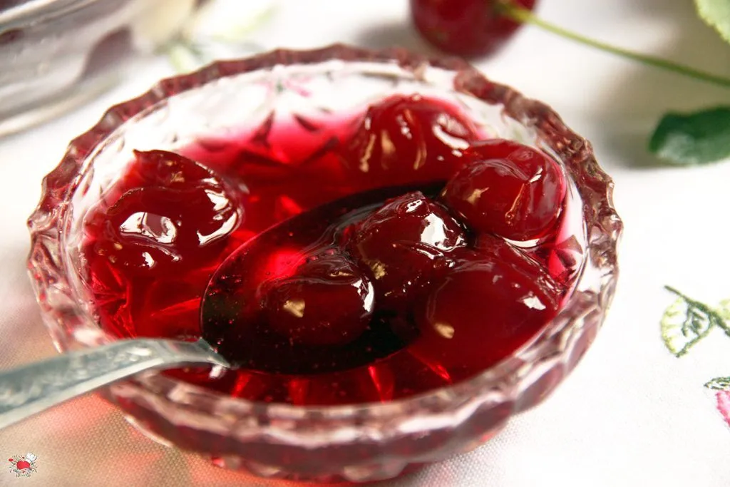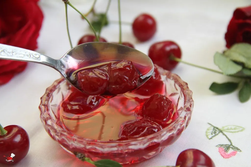 Da li je potrebno napomenuti da za pripremu slatke zimnice uvek imamo posebnu šerpu koja služi samo u te svrhe. U posudu za kuvanje stavite šećer i dodajte vodu, promešajte da se šećer sjedini sa vodom i kuvajte na laganoj vatri da se šećer otopi, a sirup postane gust. Sirup je gotov kad se na njemu pojave mehurići, a na stranicama posude šećer počne blago da se kristališe. Tada u sirup dodajte višnje a posudu samo protresite kako bi se višnje lepo rasporedile po sirupu, nema mešanja kašikom. Nakon dodavanja višanja slatko kuvajte na malo jačoj vatri, na taj način boja voća će ostati prirodnija. Povremeno u toku kuvanja protresite posudu kako slatko ne bi prigorelo. Pri kraj kuvanja sa površine sakupite kašikom penu koja se stvorila u toku kuvanja, ali tek onda kada pena postane gusta. Slatko kuvajte dok sirup ne postane gust kao med i staklasto proziran. Ali opet vodeći računa o tome da će sirup tokom hlađenja postati još gušći.