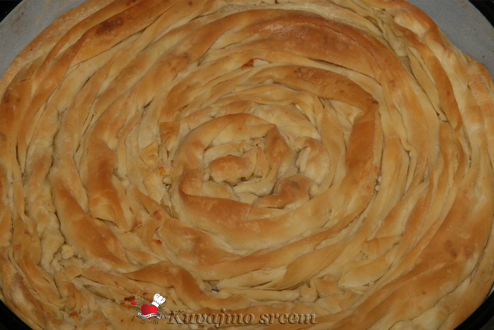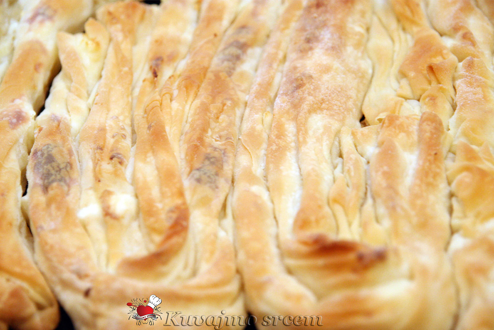 Testo pripremiti na sledeći način: prvo u veći deo brašna dodati so, 2–3 kašike ulja, lagano dodajući mlaku vodu. Testo dobroizraditi rukama, postepeno dodavati brašno dok se ne dobije glatko, srednje meko testo. Umešeno testo prebaciti na pobrašnjenoj površini i podeliti na više jednakih loptica, svaku lopticu malo istanjiti oklagijom i premazati uljem (da testo ne bi uhvatilo ,,koricu,, po površini), tako pripremljene loptice testa prekriti folijom ili pamučnom salvetom, ostaviti da odmore 10 -20 minuta. Na dobro pobrašnjenoj radnoj površini svaku lopticu istanjiti oklagijom ,,sukati,, sve dok veličina korice ne bude duplo veća od početne, tada je moguće praviti dve korice u isto vreme, dodajući na površini jedne korice malo ulje i bogato posuti brašnom, zatim preko nje prebaciti drugu koru i nastaviti sa razvijanjem, tako da se istovremeno dobiju dve kore, moram priznati za to je zaista potrebno dosta veštine, lakše je za rad kada se suče jedna kora… Kore razvijati da budu što tanje, svaku koru preliti uljem, dodati sir, skupiti koru i ređati u pouljenu tepsiju ili pleh, kore se mogu uvijati u krug ili slagati ravno jedna kraj druge. Naređanu pitu, poprskati uljem i peći u već zagrejanoj rerni na 180 – 200 stepeni, dok pita lepo ne porumeni.