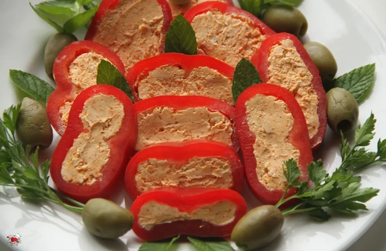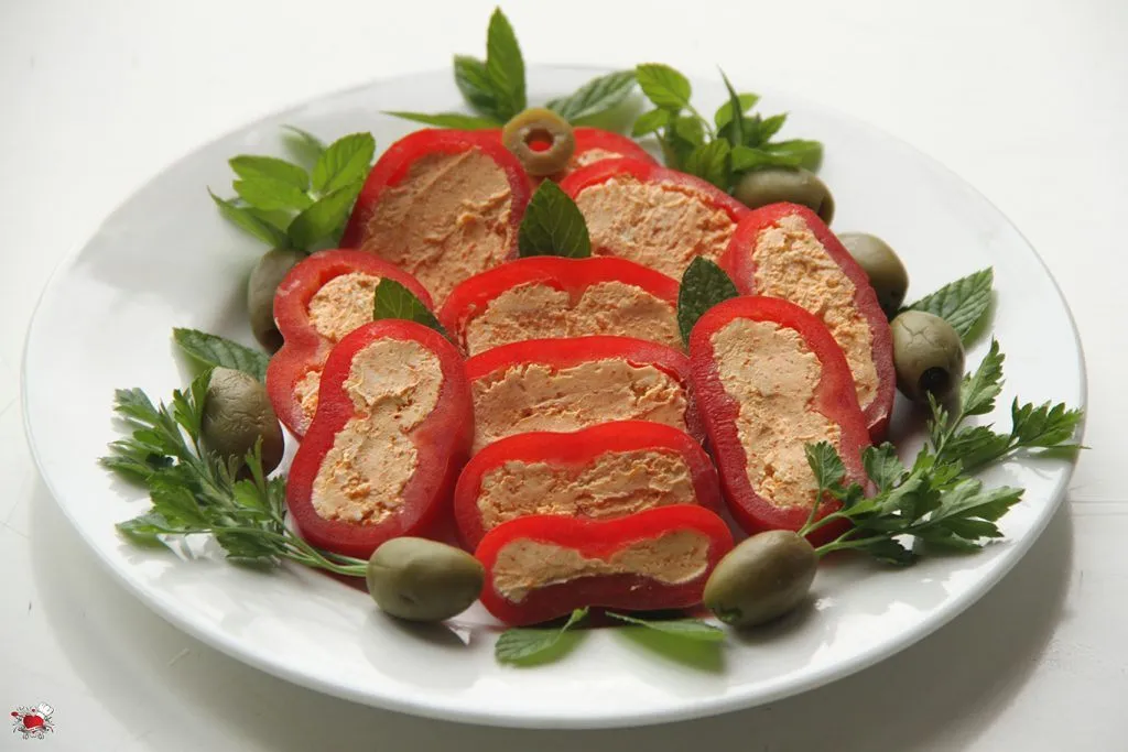 Crvene paprike oprati i izvaditi im seme.Sir dobro isitniti pa mu dodati kajmak i sve dobro promešati. Ljute papričice ispeći, oljuštiti i iseckati na sitnije komadiće. Beli luka očistiti i usitniti u avanu ili iseći na sitno. Sve sjediniti sa sirom i kajmakom, dodati alevu papriku, po želji ljutu ili slatku kao i malo ulja. Sve dobro promešati da se dobije ujednačena masa. Pripremljenom masom od sira napuniti crvene paprika, iseći ih na kolutove i servirati na tacni uz masline i listiće začinskog bilja. Poslužiti kao hladno predjelo…