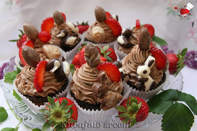 Na laganoj vatri ugrejati 500 ml slatke pavlake vodeći računa da ne provri. Vruću slatku pavlaku dodati sitno izlomljenoj čokoladi i mešati da se čokolada otopi, ostaviti masu da se ohladi. Može se staviti u frižider 1,5 – 2 sata. Ohlađen krem staviti u kesu za dekoraciju i zvezdastim nastavkom filovati mafine, dodati jagode i uskršnje čokoladne motive.